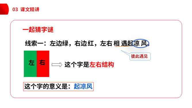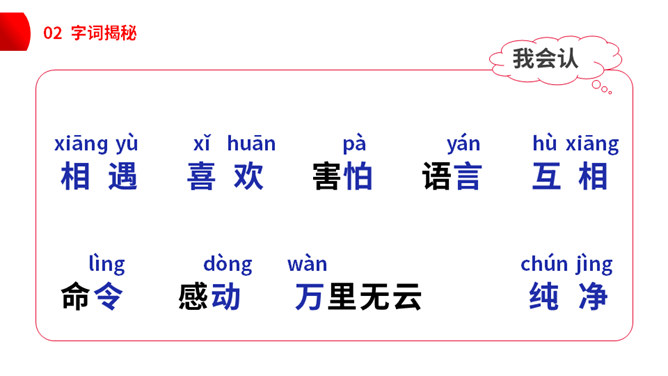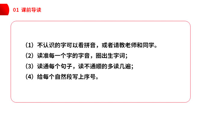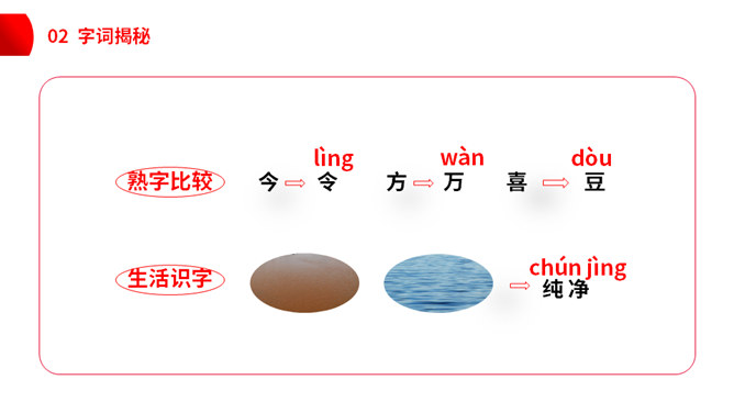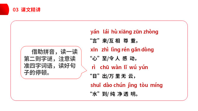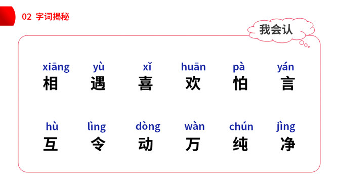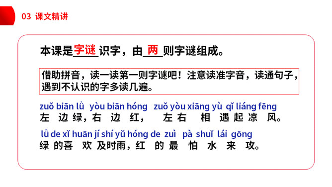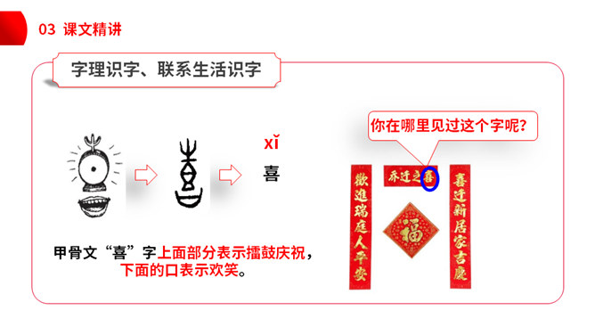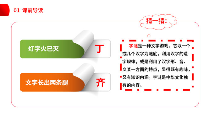 (1)不认识的字可以看拼音,或者请教老师和同学。(2)读准每一个字的字音,圈出生字词;(3)读通每个句子,读不通顺的多读几遍;(4)给每个自然段写上序号。字谜是一种文字游戏,它以一个或几个汉字为谜底,利用汉字的造字规律,或是利用了汉字形、音、义某一方面的特点,显得既有趣味,又有知识内涵。字谜是中华文化独有的内容。借助拼音,读一读第一则字谜吧!注意读准字音,读通句子,遇到不认识的字多读几遍。甲骨文“喜”字上面部分表示擂鼓庆祝,下面的口表示欢笑。所属专题:猜字谜ppt。