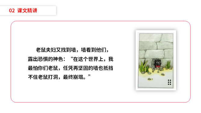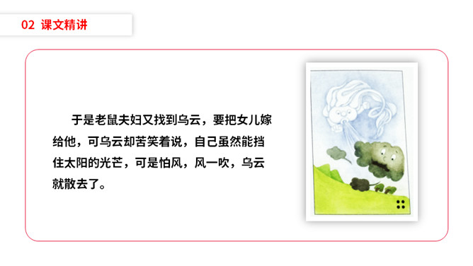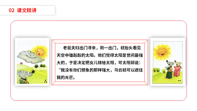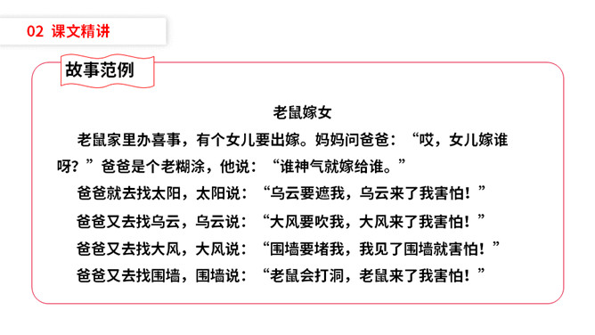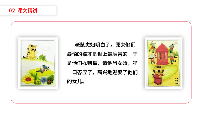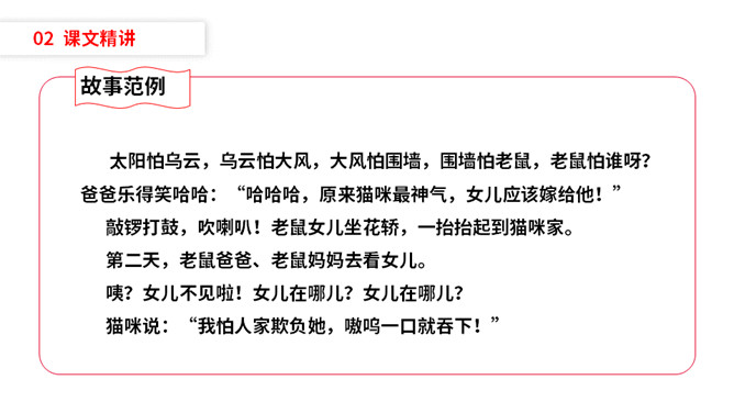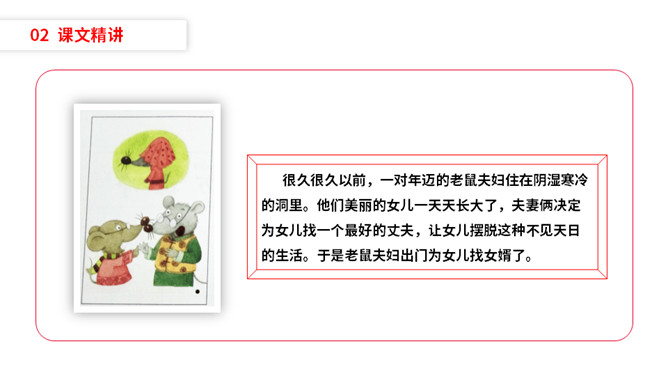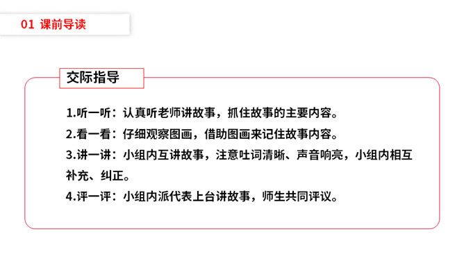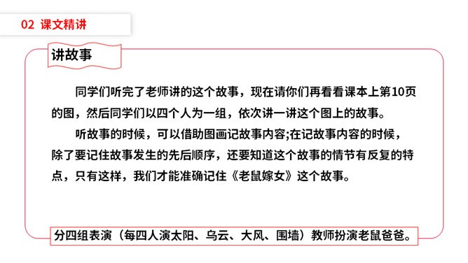 1.听一听:认真听老师讲故事,抓住故事的主要内容。2.看一看:仔细观察图画,借助图画来记住故事内容。3.讲一讲:小组内互讲故事,注意吐词清晰、声音响亮,小组内相互补充、纠正。4.评一评:小组内派代表上台讲故事,师生共同评议。同学们听完了老师讲的这个故事,现在请你们再看看课本上第10页的图,然后同学们以四个人为一组,依次讲一讲这个图上的故事。听故事的时候,可以借助图画记故事内容;在记故事内容的时候,除了要记住故事发生的先后顺序,还要知道这个故事的情节有反复的特点,只有这样,我们才能准确记住《老鼠嫁女》这个故事。所属专题:听故事讲故事ppt。