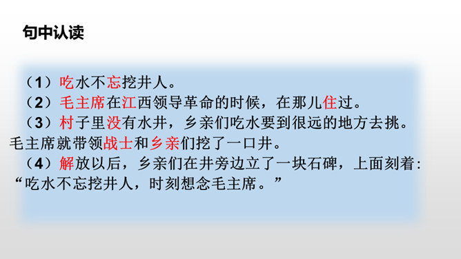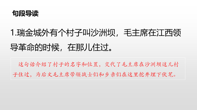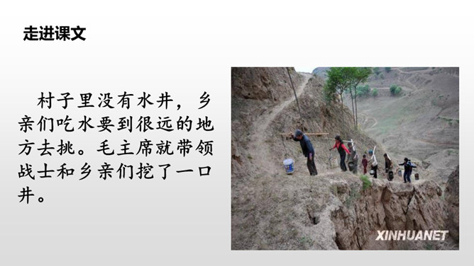 这句话介绍了村子的名字和位置,交代了毛主席在沙洲坝这儿村子住过,为后文毛主席带领战士们和乡亲们在这里挖井埋下伏笔。很远”一词说明了相亲们距离水源地非常远,乡亲们吃水非常困难,解决吃水问题迫在眉睫。这句话说出了毛主席为乡亲们挖水井的具体原因。在朗读的时候,“没有”这个词读的要重一些,“很远”读的要稍微长一些。这句话体现了乡亲们对毛主席的怀念和崇敬之情,揭示了饮水思源这一道理。毛主席为乡亲们挖了一口井,这一口井不仅给群众送去了清凉、甘甜的饮用水,更送去了毛主席对老百姓的关爱。所属专题:吃水不忘挖井人ppt。