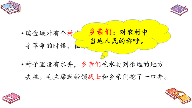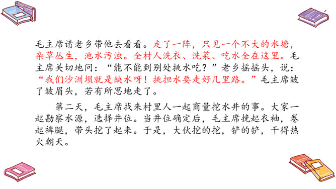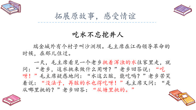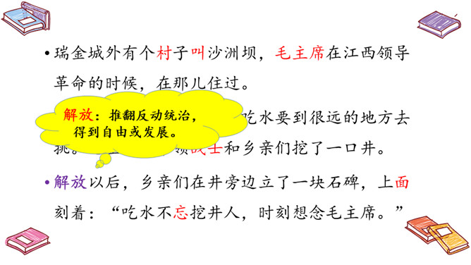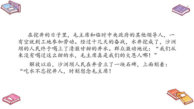 自读提示:1.朗读课文,标出自然段;2.圈出不认识的生字,借助拼音读正确。再读课文,提取信息,课文中的“挖井人”是谁?为什么要挖井呢?口字在左边时,书写要靠中上;口字要写好,上大下要小。乡亲们:对农村中当地人民的称呼。所属专题:吃水不忘挖井人ppt。