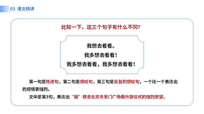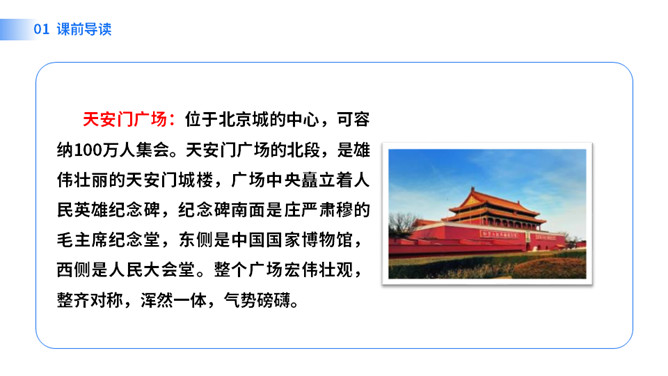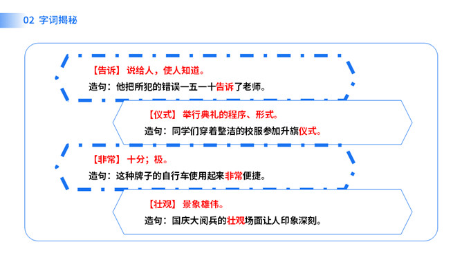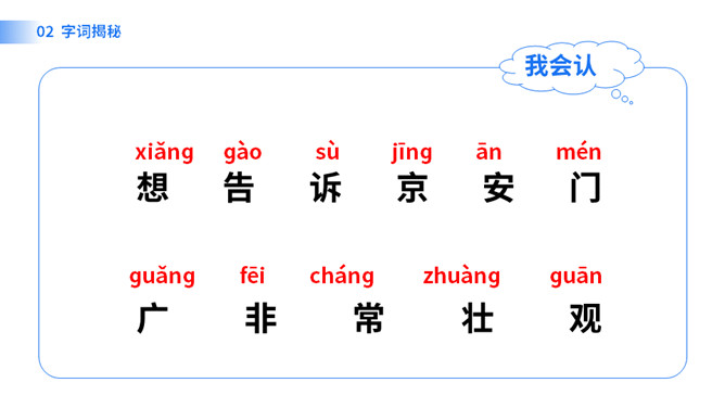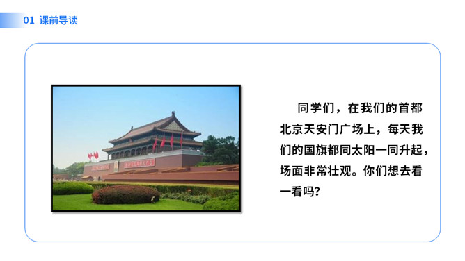 同学们,在我们的首都北京天安门广场上,每天我们的国旗都同太阳一同升起,场面非常壮观。你们想去看一看吗?(1)不认识的字可以看拼音,或者请教老师和同学。(2)读准每一个字的字音,圈出生字词;(3)读通每个句子,读不通顺的多读几遍;(4)给每个自然段写上序号。【告诉】 说给人,使人知道。造句:他把所犯的错误一五一十告诉了老师。【仪式】 举行典礼的程序、形式。造句:同学们穿着整洁的校服参加升旗仪式。所属专题:我多想去看看ppt。