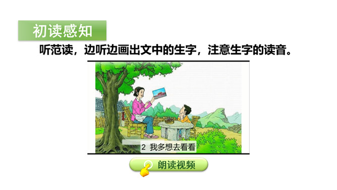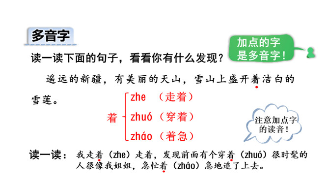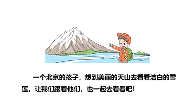 一个北京的孩子,想到美丽的天山去看看洁白的雪莲。让我们跟着他们,也一起去看看吧!请同学们自由朗读课文,努力读准字音、读通句子。指名读课文,同学互评:字音是否正确,句子是否通顺。读一读下面的句子,看看你有什么发现?有感情地朗读课文,读准字音,读好带感叹号的句子。初读课文后,你感受到了什么?示例:初读课文后,我感受到了少年儿童对祖国山河的热爱之情。所属专题:我多想去看看ppt。