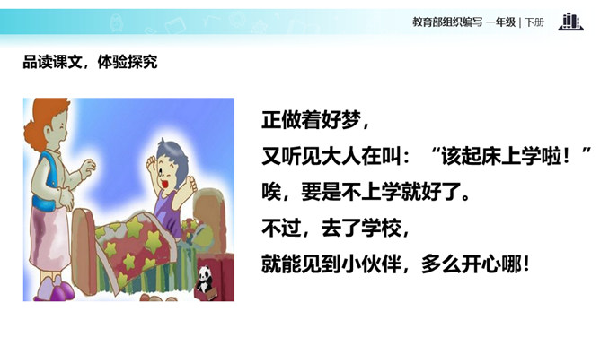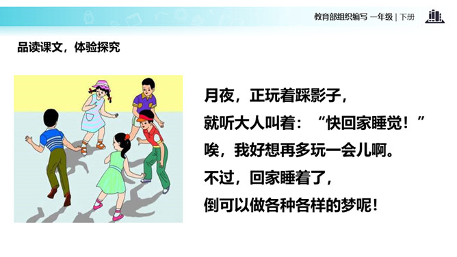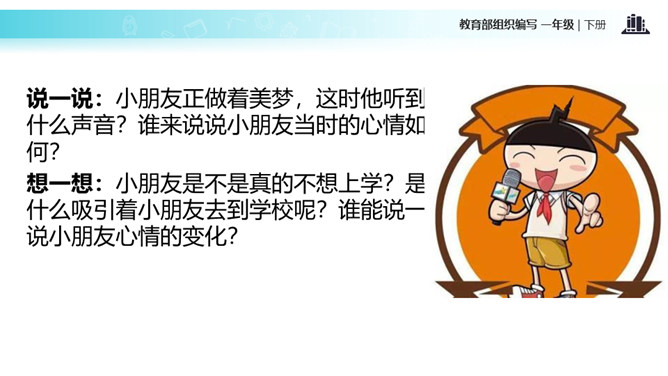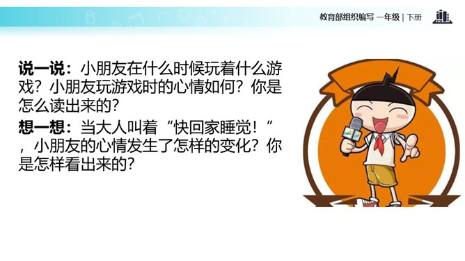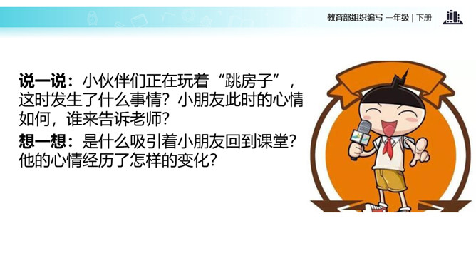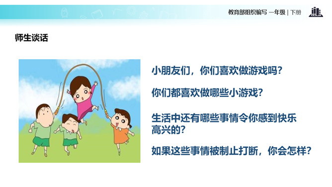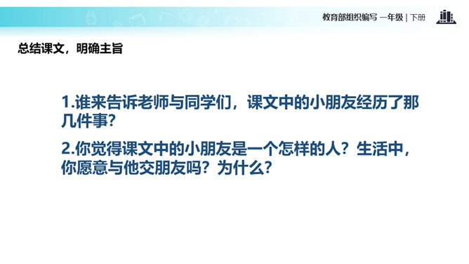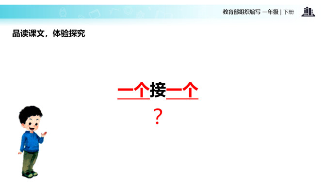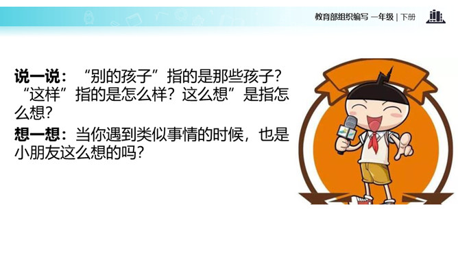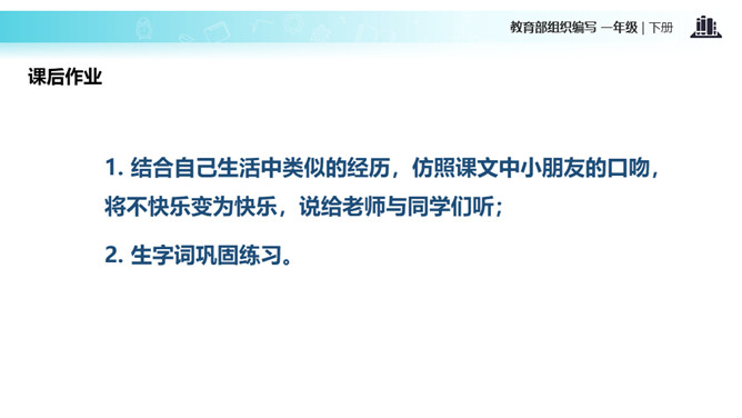 1. 结合自己生活中类似的经历,仿照课文中小朋友的口吻,将不快乐变为快乐,说给老师与同学们听;2. 生字词巩固练习。总结课文,明确主旨:1.谁来告诉老师与同学们,课文中的小朋友经历了那几件事?2.你觉得课文中的小朋友是一个怎样的人?生活中,你愿意与他交朋友吗?为什么?说一说:“别的孩子”指的是那些孩子?“这样”指的是怎么样?这么想”是指怎么想?所属专题:一个接一个ppt。