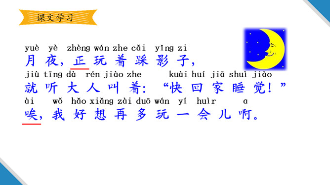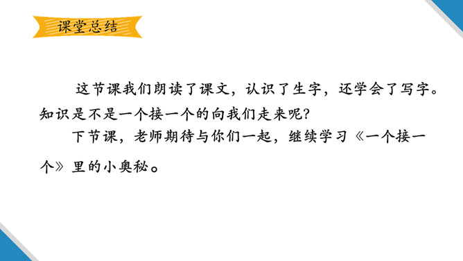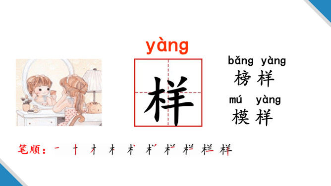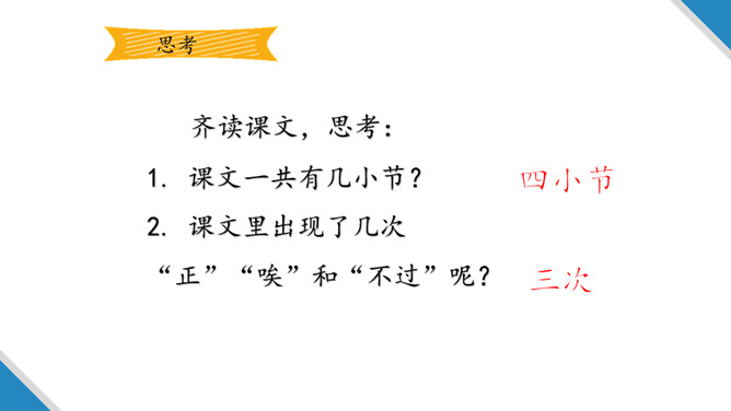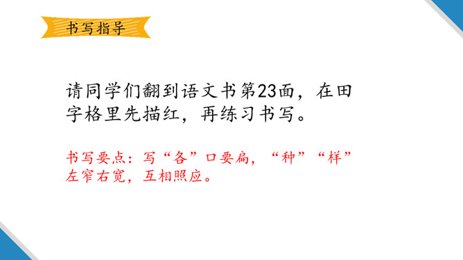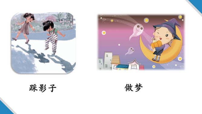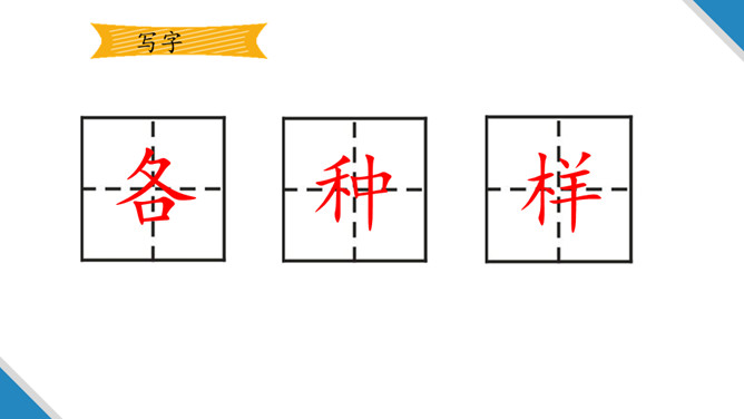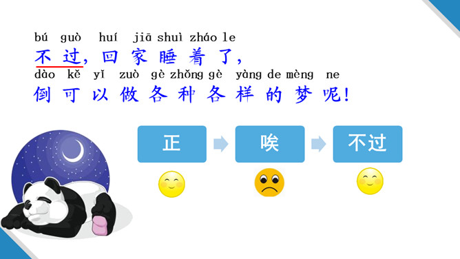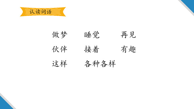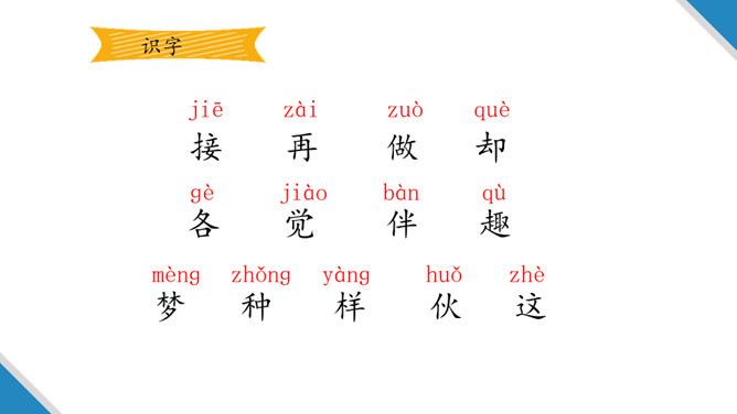 认真听范读,说一说主人公在这一天当中都做了哪些事情?自由朗读课文,把生字用铅笔圈出来,多读几遍。齐读课文,思考:1. 课文一共有几小节?2. 课文里出现了几次“正”“唉”和“不过”呢?你做过梦么?梦里你的心情是怎样的?和大家说一说。总结:有的梦是开心的,有的梦是恐怖的, 有的梦是兴奋的。这就是“各种各样”的梦。请同学们翻到语文书第23面,在田字格里先描红,再练习书写。所属专题:一个接一个ppt。