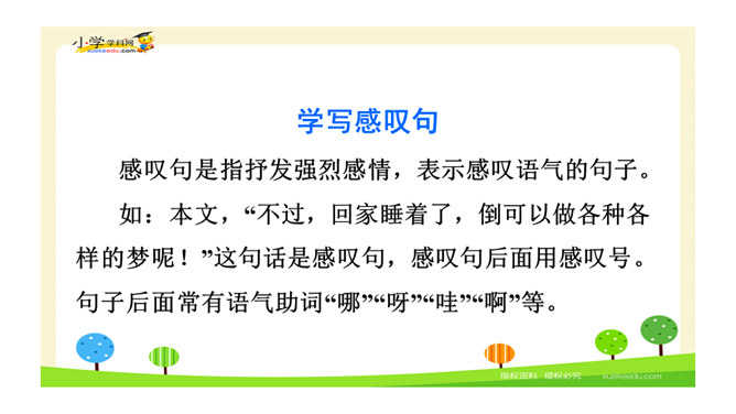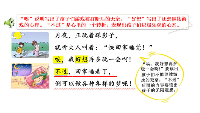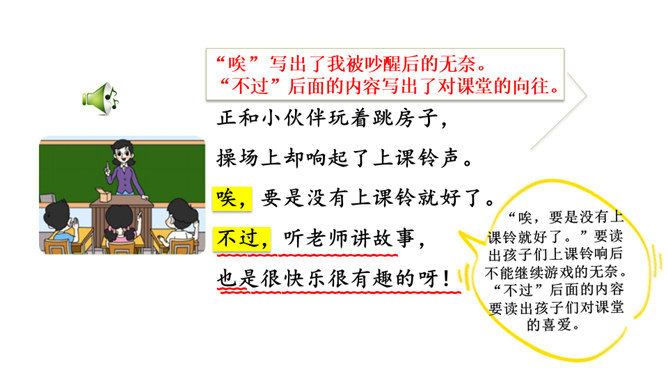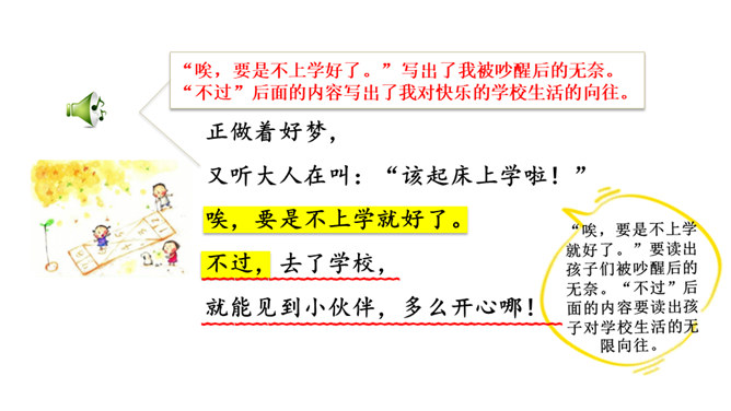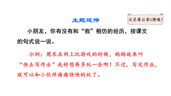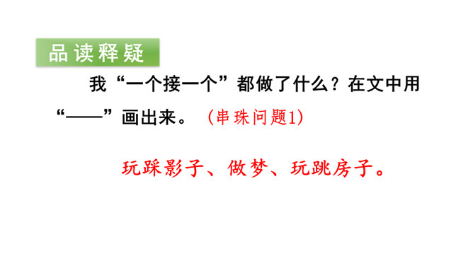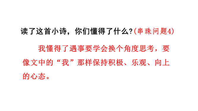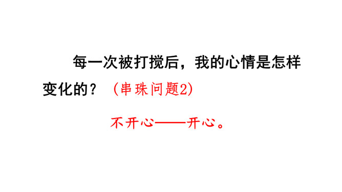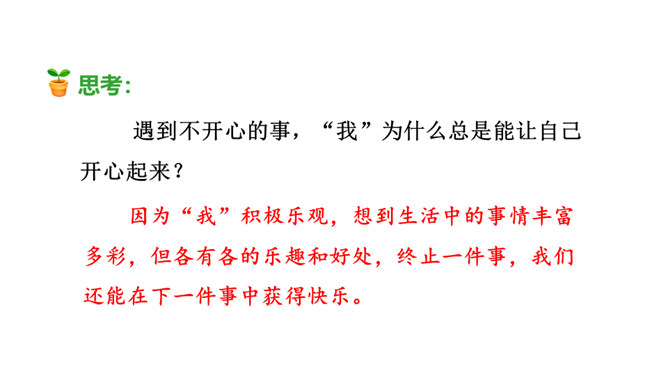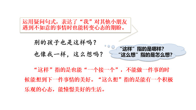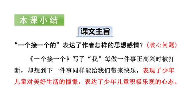 表达了作者怎样的思想感情?(核心问题)写了“我”每做一件事正高兴时被打断,却想到下一件事同样能给我们带来快乐,表现了少年儿童对美好生活的憧憬,表达了少年儿童积极乐观的心态。这是一首儿童诗,以时间为序,用儿童最自然的语言,描写了一个小朋友在不同的时间应该做的事,以及他的心里想法的变化。让我们感受到了少年儿童乐观、向上的生活态度。小朋友,你有没有和“我”相仿的经历,按课文的句式说一说。所属专题:一个接一个ppt。