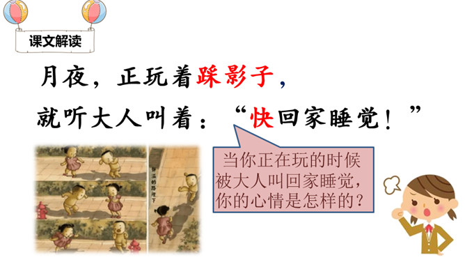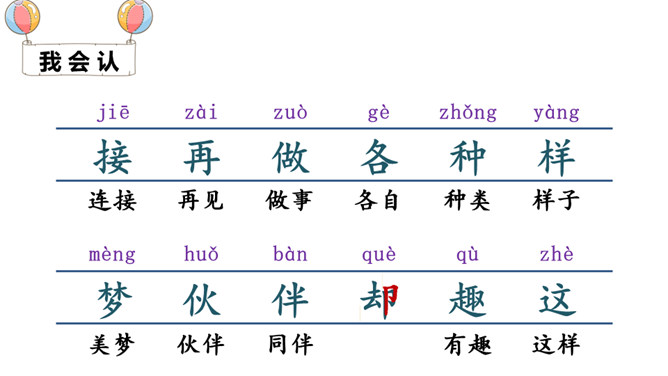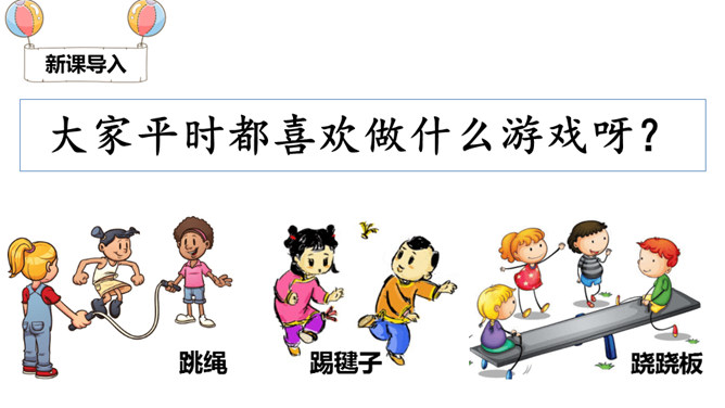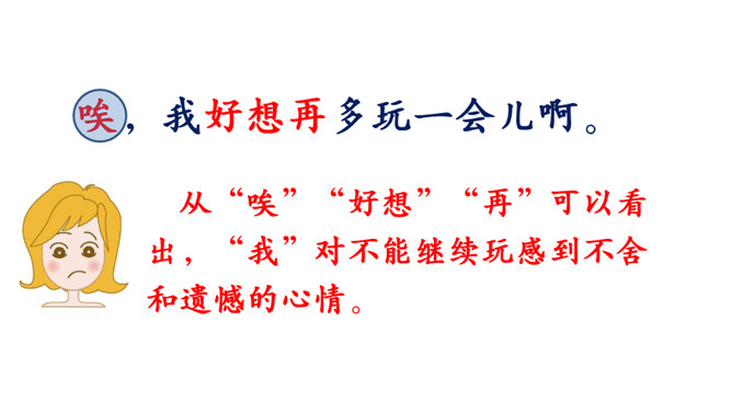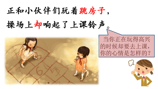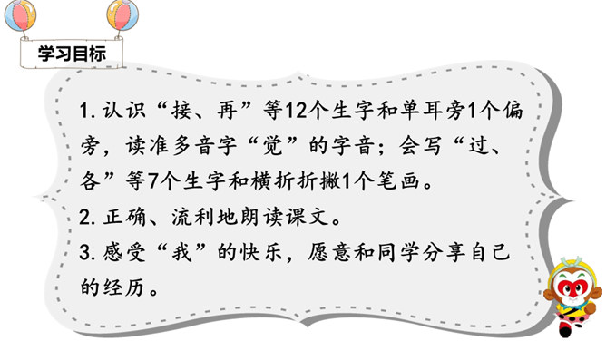 大家平时都喜欢做什么游戏呀?学习目标:1.认识“接、再”等12个生字和单耳旁1个偏旁,读准多音字“觉”的字音;会写“过、各”等7个生字和横折折撇1个笔画。2.正确、流利地朗读课文。3.感受“我”的快乐,愿意和同学分享自己的经历。听朗读,然后自己试着读一读,注意读准字音,不会的字多读几遍!从“唉”“好想”“再”可以看出,“我”对不能继续玩感到不舍和遗憾的心情。别的孩子也是这样吗?也像我一样,这么想吗?所属专题:一个接一个ppt。