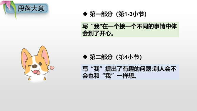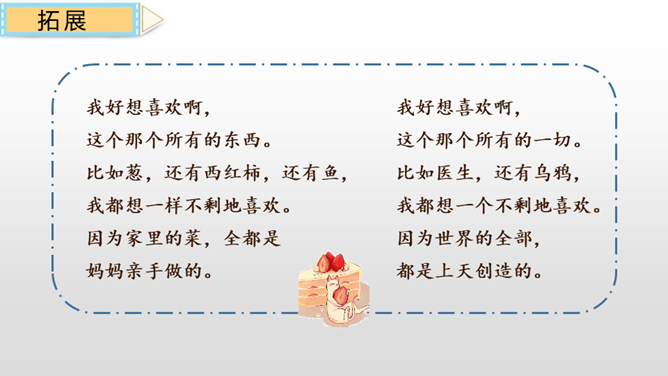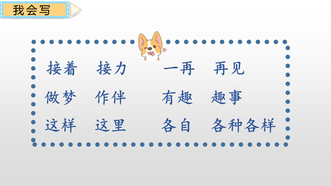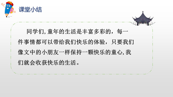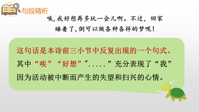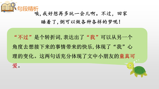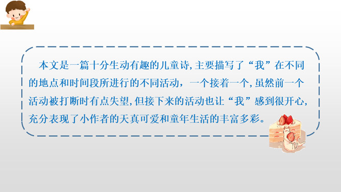 本文是一篇十分生动有趣的儿童诗,主要描写了“我”在不同的地点和时间段所进行的不同活动,一个接着一个,虽然前一个活动被打断时有点失望,但接下来的活动也让“我”感到很开心,充分表现了小作者的天真可爱和童年生活的丰富多彩。不过”是个转折词,表达出了“我”可以从另一个角度去想接下来的事情带来的快乐,体现了“我”心理的变化。这两句话充分体现了文中小朋友的童真可爱。所属专题:一个接一个ppt。