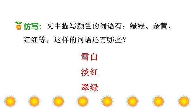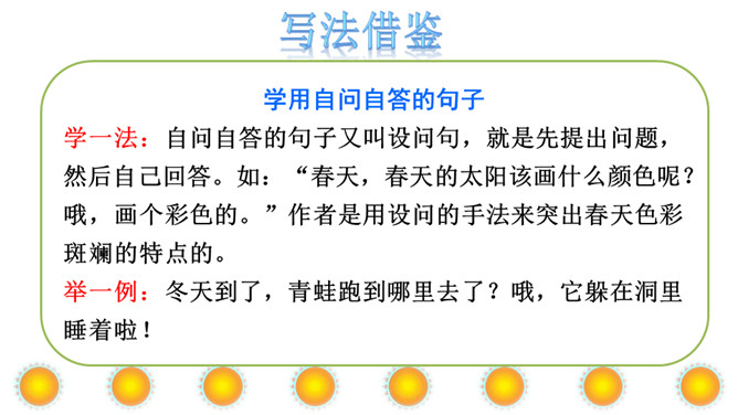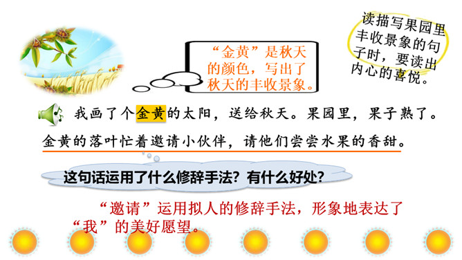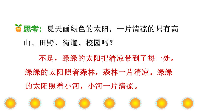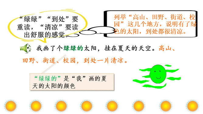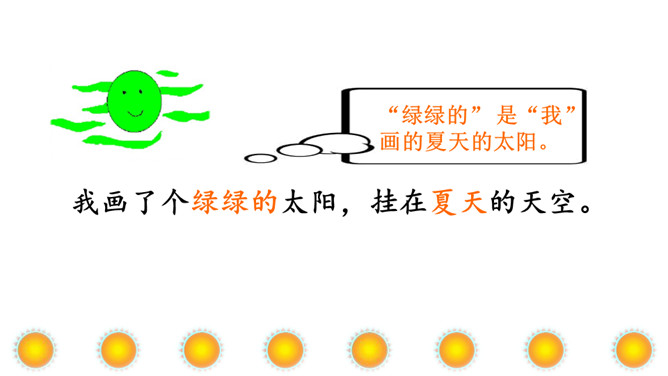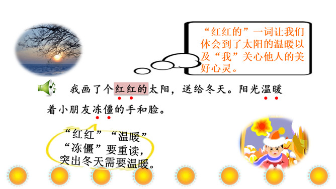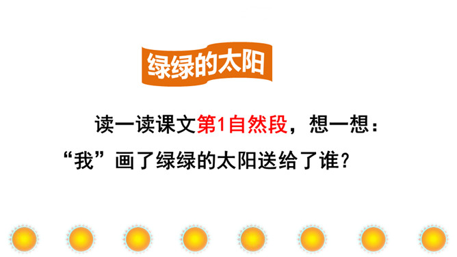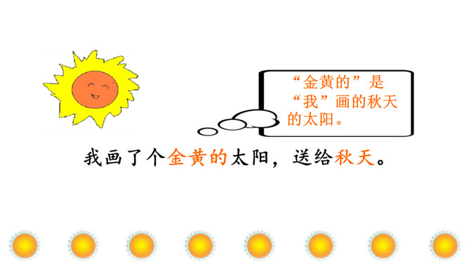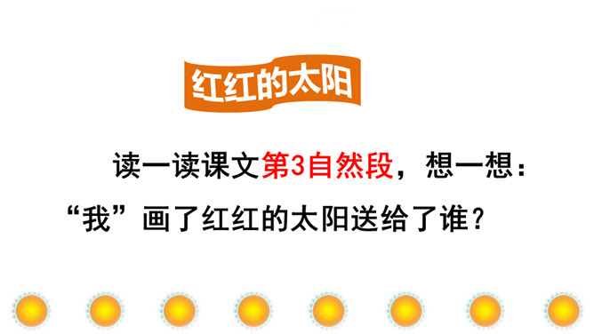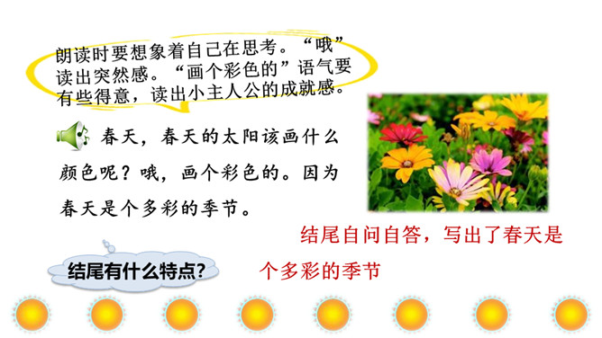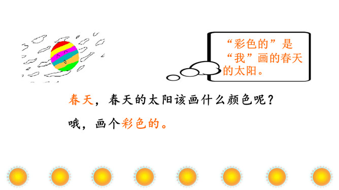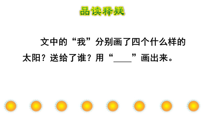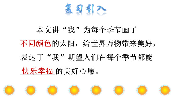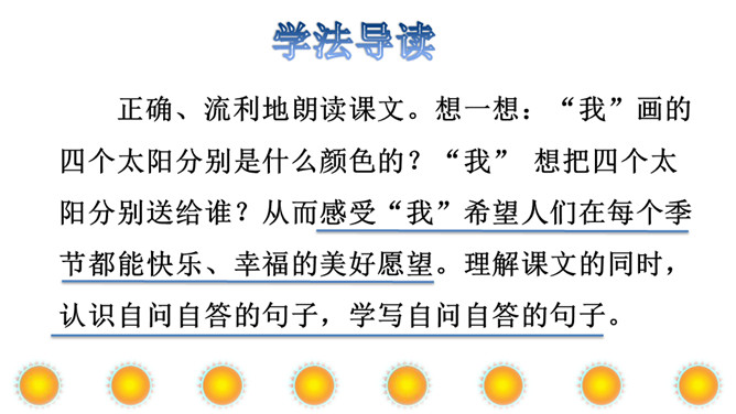 本文讲“我”为每个季节画了不同颜色的太阳,给世界万物带来美好,表达了“我”期望人们在每个季节都能快乐幸福的美好心愿。正确、流利地朗读课文。想一想:“我”画的四个太阳分别是什么颜色的?“我” 想把四个太阳分别送给谁?从而感受“我”希望人们在每个季节都能快乐、幸福的美好愿望。理解课文的同时,认识自问自答的句子,学写自问自答的句子。文中的“我”分别画了四个什么样的太阳?送给了谁?画出来。所属专题:四个太阳ppt。
