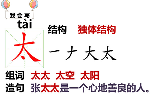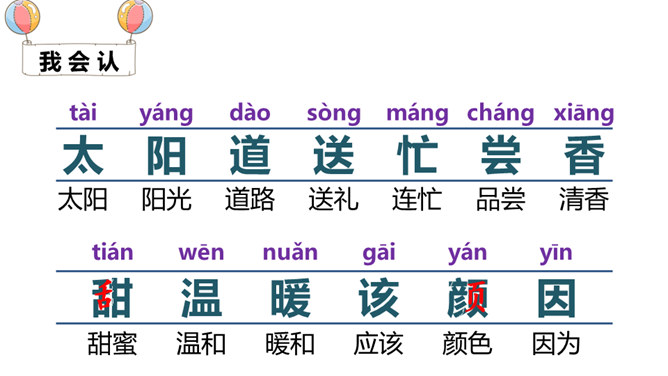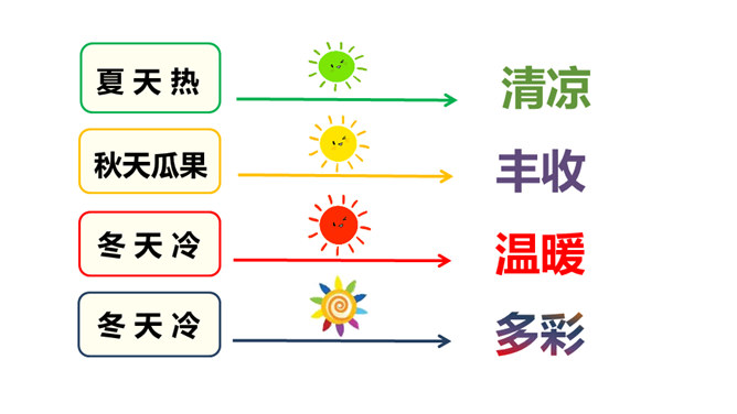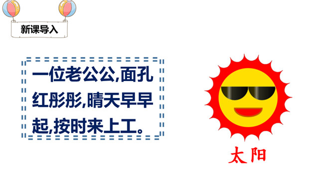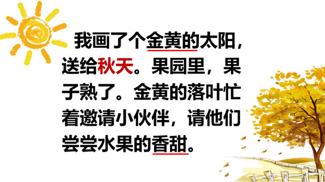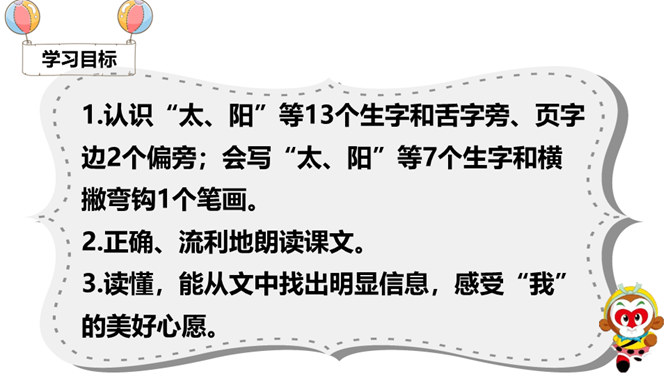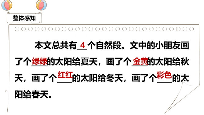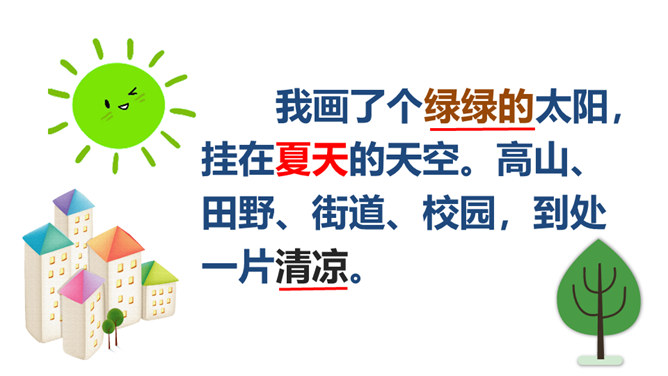 听朗读,然后自己试着读一读,注意读准字音,不会的字多读几遍!1.认识“太、阳”等13个生字和舌字旁、页字边2个偏旁;会写“太、阳”等7个生字和横撇弯钩1个笔画。2.正确、流利地朗读课文。3.读懂,能从文中找出明显信息,感受“我”的美好心愿。春天,春天的太阳该画什么颜色呢?为什么会有画绿绿的、金黄的、红红的、彩色的这4个不同的太阳的愿望呢?朗读课文。说说你会为每个季节画什么颜色的太阳,试着画一画,并说明理由。所属专题:四个太阳ppt。