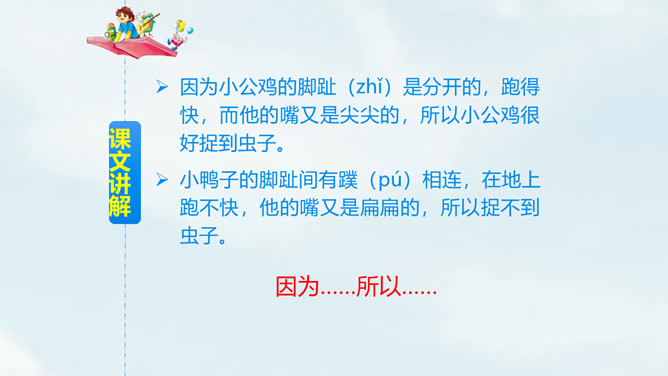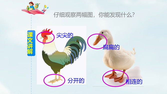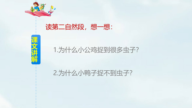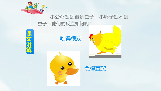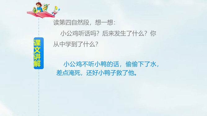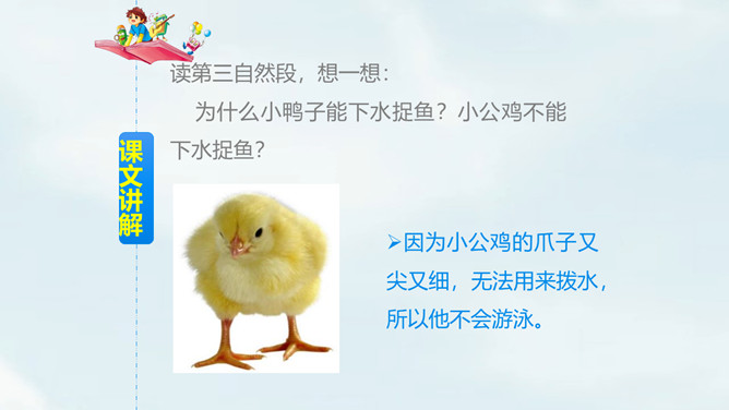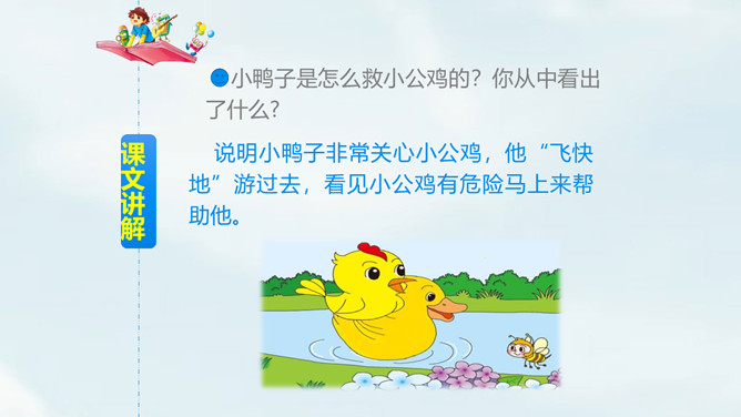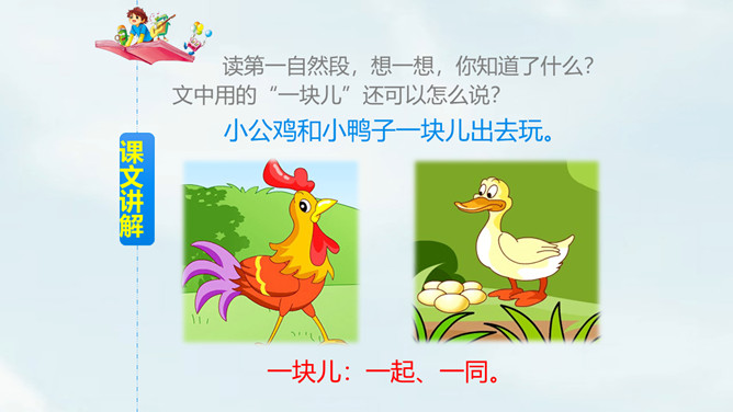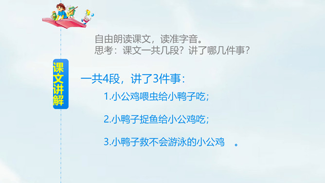 自由朗读课文,读准字音。思考:课文一共几段?讲了哪几件事?一共4段,讲了3件事:1.小公鸡喂虫给小鸭子吃;2.小鸭子捉鱼给小公鸡吃;3.小鸭子救不会游泳的小公鸡。读第一自然段,想一想,你知道了什么?文中用的“一块儿”还可以怎么说?小公鸡和小鸭子一块儿出去玩。读第二自然段,想一想:1.为什么小公鸡捉到很多虫子?2.为什么小鸭子捉不到虫子?仔细观察两幅图,你能发现什么?所属专题:小公鸡和小鸭子ppt。