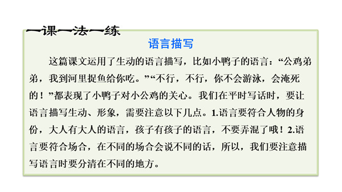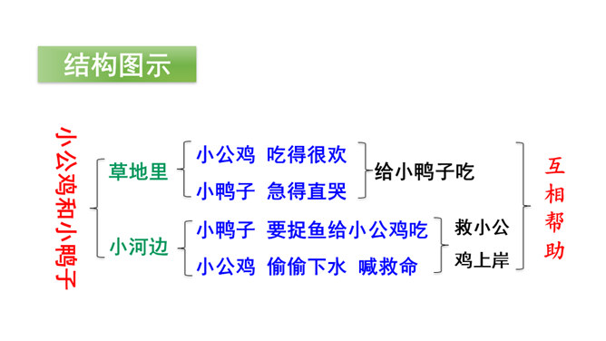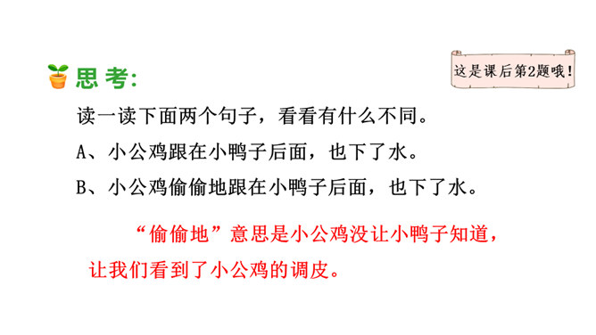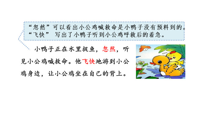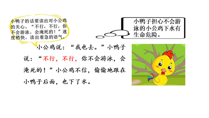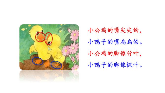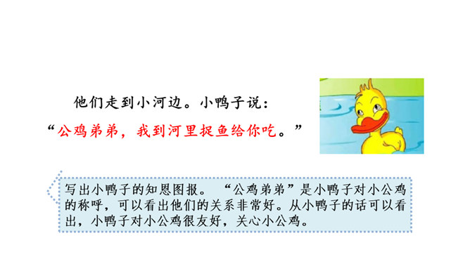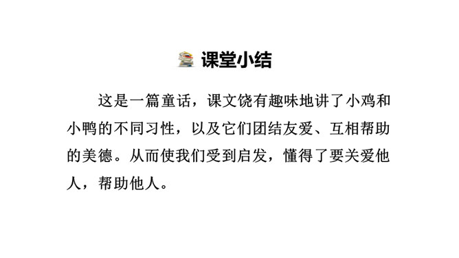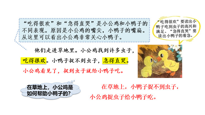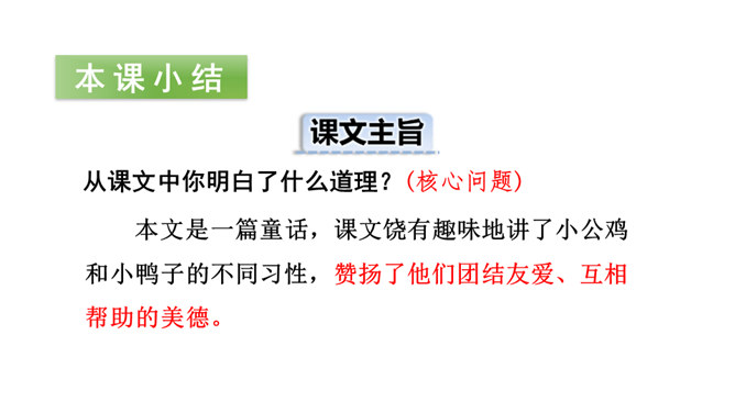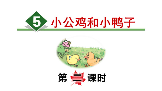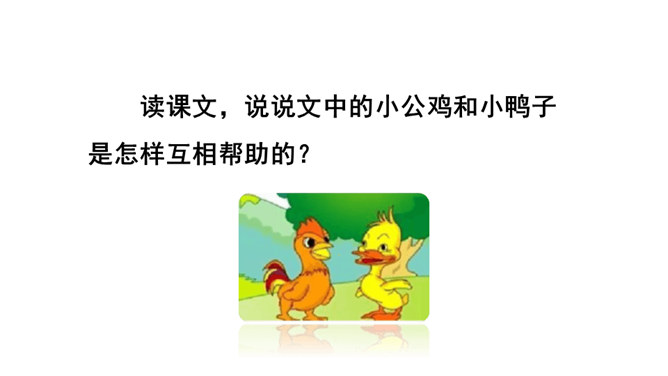 看插图,说说小公鸡和小鸭子哪里长的不一样?让我们用摘苹果的方法来复习一下上节课认识的生字宝宝吧!读课文,说说文中的小公鸡和小鸭子是怎样互相帮助的?“吃得很欢”和“急得直哭”是小公鸡和小鸭子的不同表现。原因是小公鸡的嘴尖,小鸭子的嘴扁。从这里可以看出小公鸡非常关心小鸭子。“公鸡弟弟”是小鸭子对小公鸡的称呼,可以看出他们的关系非常好。从小鸭子的话可以看出,小鸭子对小公鸡很友好,关心小公鸡。所属专题:小公鸡和小鸭子ppt。