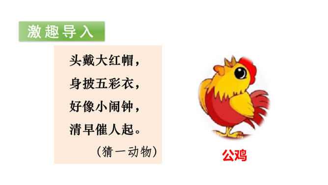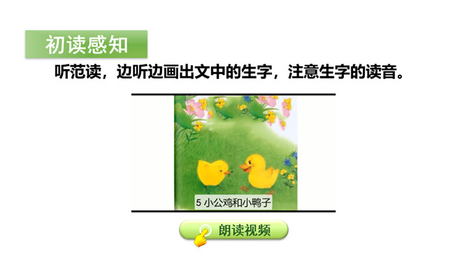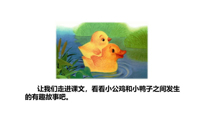 让我们走进课文,看看小公鸡和小鸭子之间发生的有趣故事吧。听范读,边听边画出文中的生字,注意生字的读音。请同学们自由朗读课文,努力读准字音、读通句子。指名读课文,同学互评:字音是否正确,句子是否通顺。 读一读下面的句子,看看你有什么发现?读课文后,你感受到了什么?示例:初读课文后,我感受到了小公鸡和小鸭子之间的团结友爱,互相帮助。有感情地朗读课文,注意读准字音,读好小公鸡和小鸭子的对话。所属专题:小公鸡和小鸭子ppt。