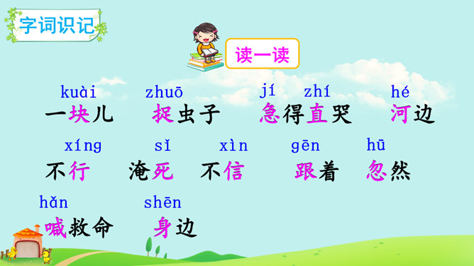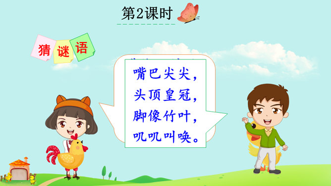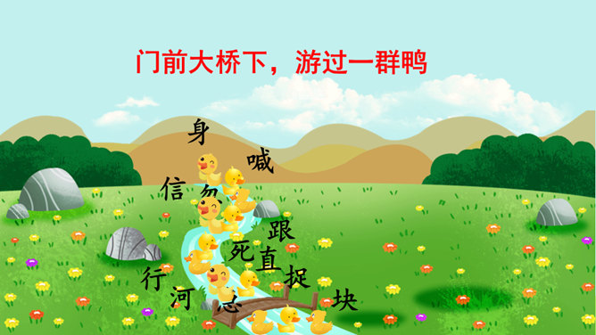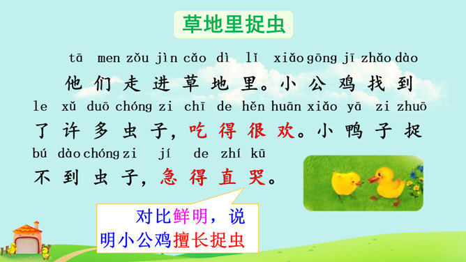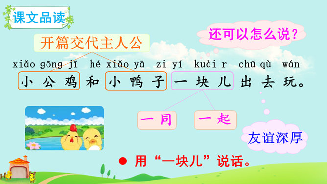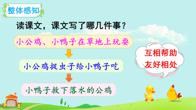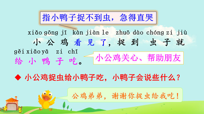 本课朗读有两个重点:一是读好“不”的声调。“不”的本调是四声,在单独使用、用在词句末尾或非四声字前时仍读四声,在四声字前读二声,在动补结构的词语中间或相同词语中间读轻声。二是读好小公鸡和小鸭子的对话。读时想象小公鸡和小鸭子当时的心情、动作,体验角色的情感。如小鸭的两句话分别读出热情、担忧的语气,小公鸡的两句话分别读出迫切、感激的语气。全班交流学完本文的收获。所属专题:小公鸡和小鸭子ppt。