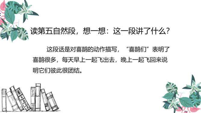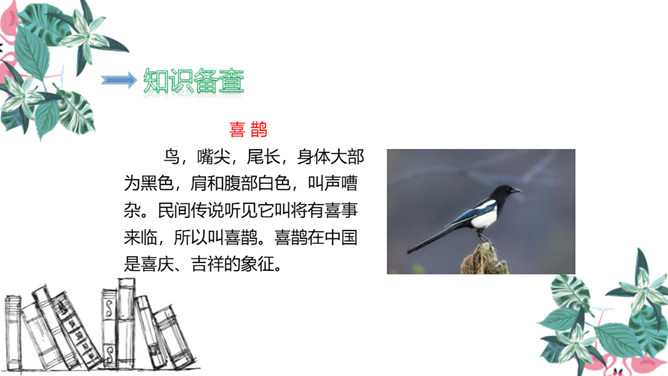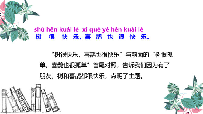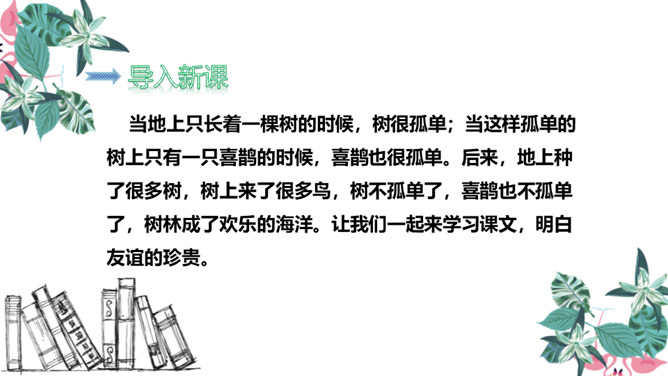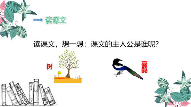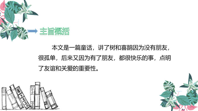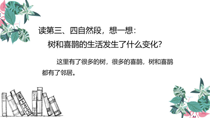 当地上只长着一棵树的时候,树很孤单;当这样孤单的树上只有一只喜鹊的时候,喜鹊也很孤单。后来,地上种了很多树,树上来了很多鸟,树不孤单了,喜鹊也不孤单了,树林成了欢乐的海洋。让我们一起来学习课文,明白友谊的珍贵。读课文,想一想:课文的主人公是谁呢?读第三、四自然段,想一想:树和喜鹊的生活发生了什么变化?这里有了很多的树,很多的喜鹊,树和喜鹊都有了邻居。所属专题:树和喜鹊ppt。