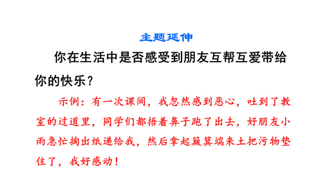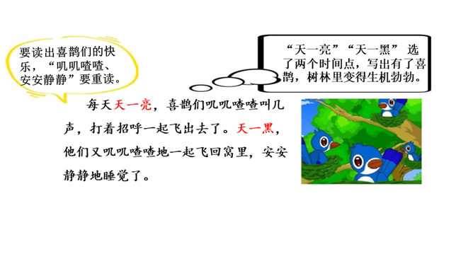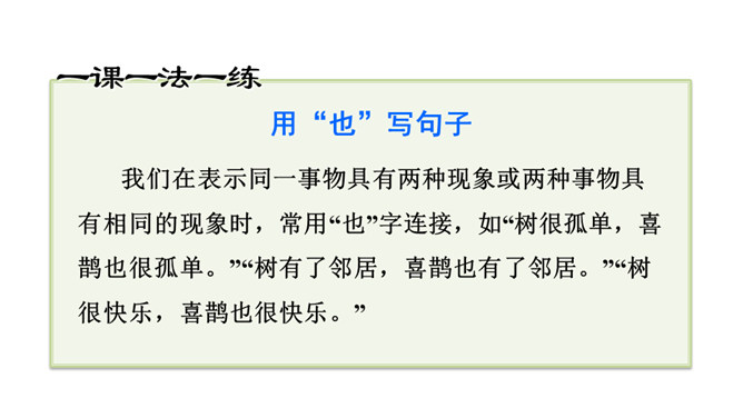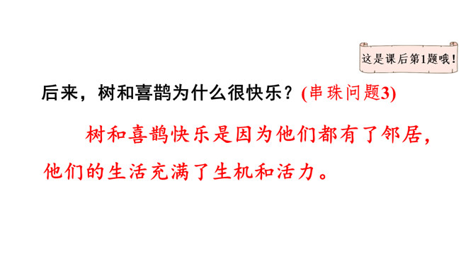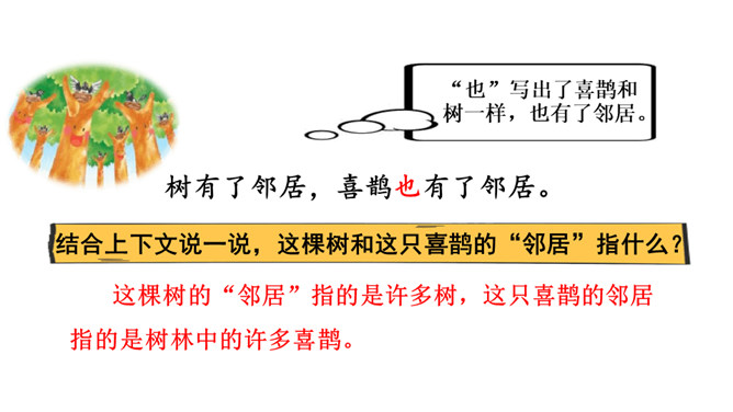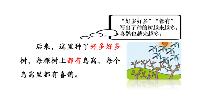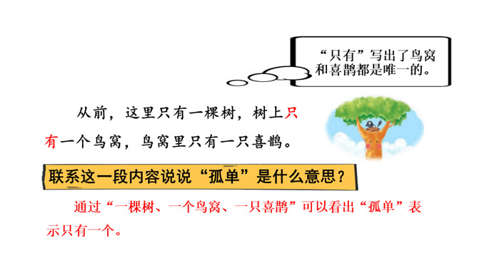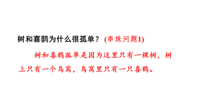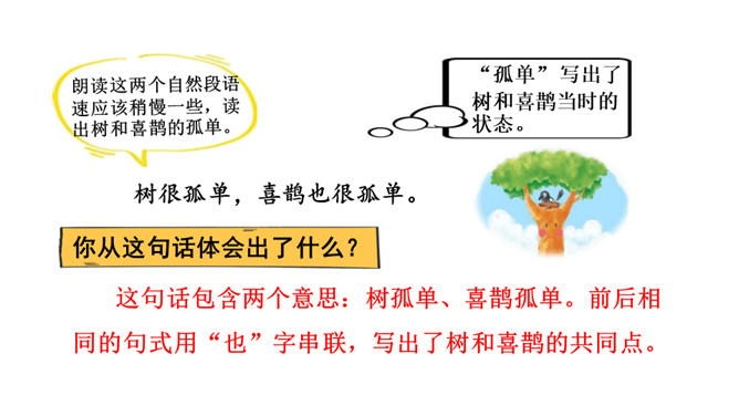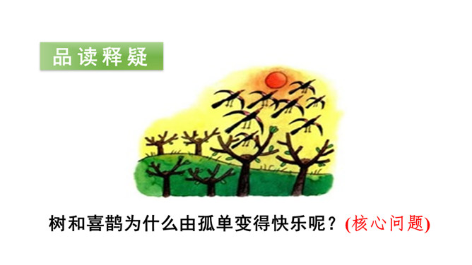 让我们用摘苹果的方法来复习一下上节课认识的生字宝宝吧!树和喜鹊为什么由孤单变得快乐呢?(核心问题)树和喜鹊为什么很孤单? (串珠问题1)树和喜鹊孤单是因为这里只有一棵树,树上只有一个鸟窝,鸟窝里只有一只喜鹊。通过“一棵树、一个鸟窝、一只喜鹊”可以看出“孤单”表示只有一个。这句话包含两个意思:树孤单、喜鹊孤单。前后相同的句式用“也”字串联,写出了树和喜鹊的共同点。本文写了树和喜鹊由孤单到快乐的经过,表现了邻居的重要性,告诉我们同学之间要有互助友爱的精神和合作意识。所属专题:树和喜鹊ppt。