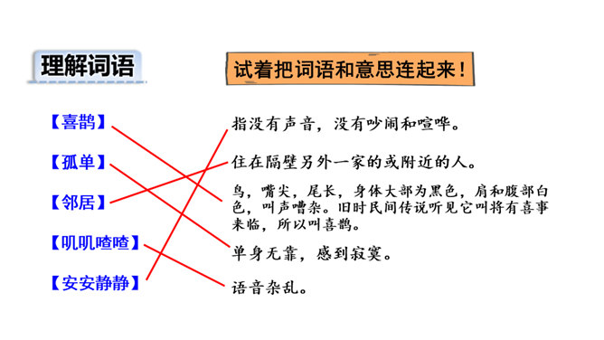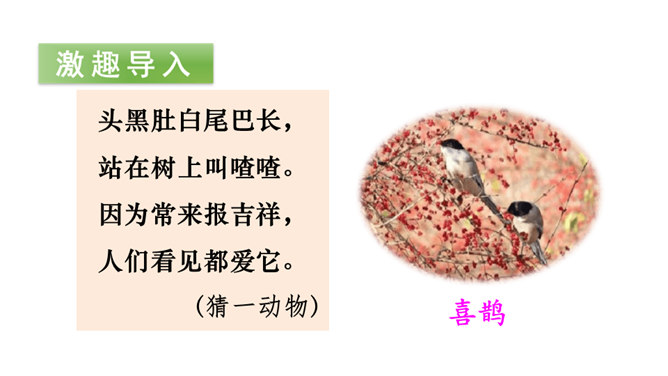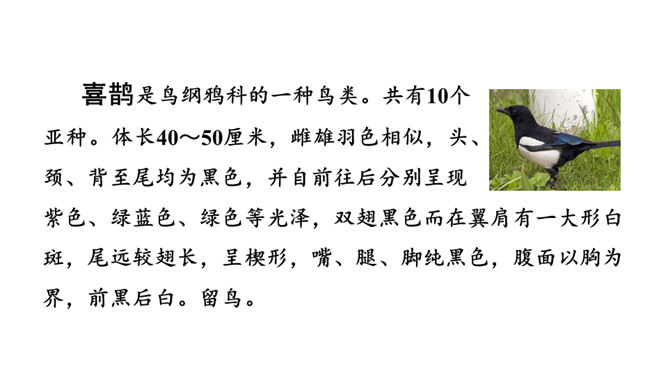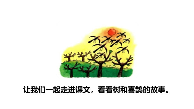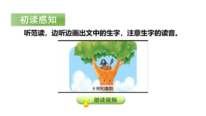 有感情地朗读课文,注意读准字音,读出树和喜鹊前后感情的变化。初读课文后,你感受到了什么?示例:初读课文后,我感受到了树和喜鹊互助友爱的精神和合作的意识。 读一读下面的句子,看看你有什么发现?指名读课文,同学互评:字音是否正确,句子是否通顺。 请同学们自由朗读课文,努力读准字音、读通句子。听范读,边听边画出文中的生字,注意生字的读音。所属专题:树和喜鹊ppt。