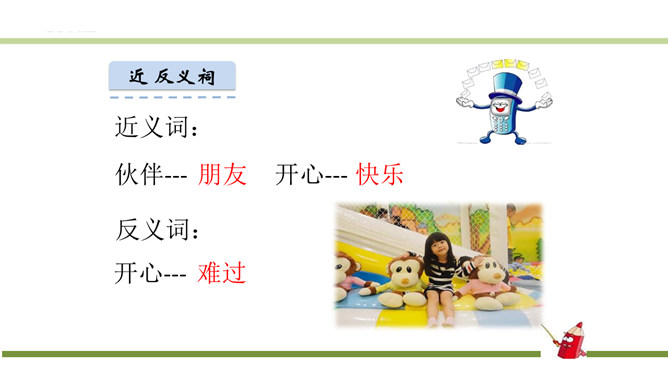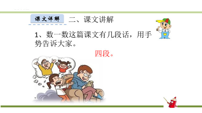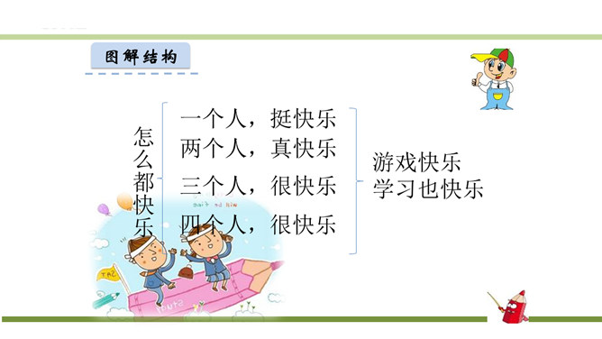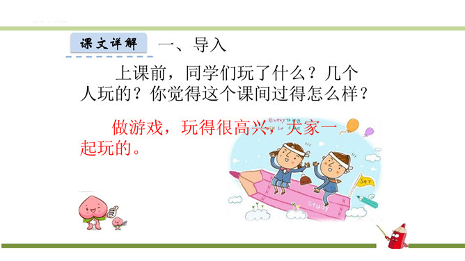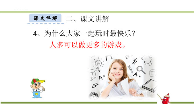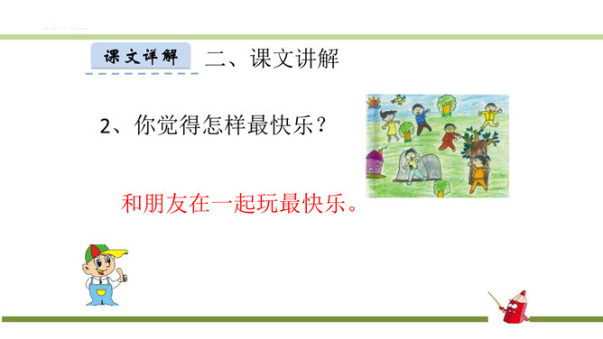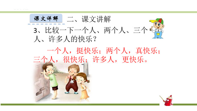 上课前,同学们玩了什么?几个人玩的?你觉得这个课间过得怎么样?做游戏,玩得很高兴,大家一起玩的。数一数这篇课文有几段话,用手势告诉大家。四段。你觉得怎样最快乐?和朋友在一起玩最快乐。比较一下一个人、两个人、三个人、许多人的快乐?一个人,挺快乐;两个人,真快乐;三个人,很快乐;许多人,更快乐。为什么大家一起玩时最快乐?人多可以做更多的游戏。所属专题:怎么都快乐ppt。