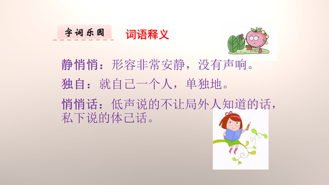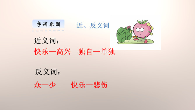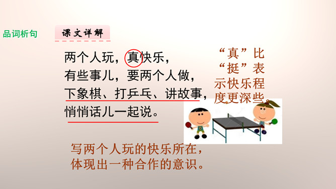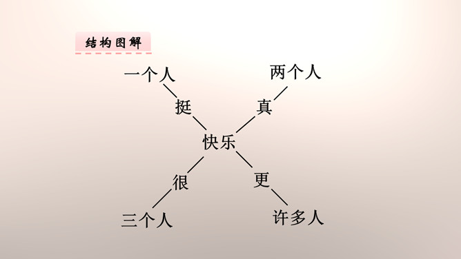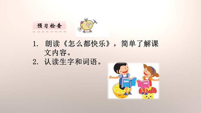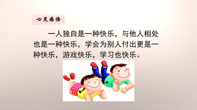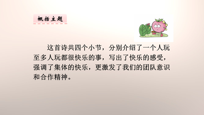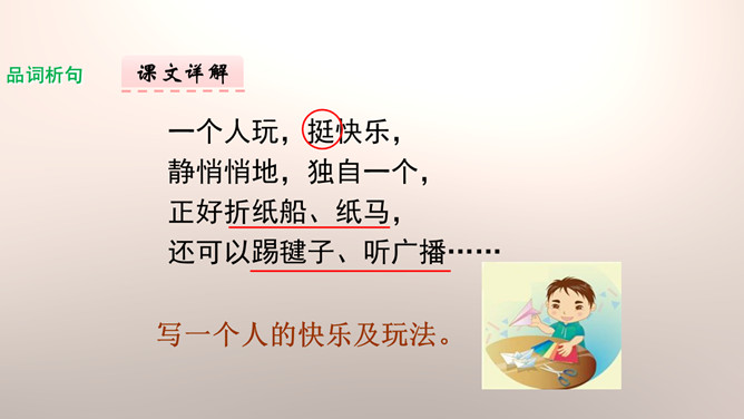 这首诗共四个小节,分别介绍了一个人玩至多人玩都很快乐的事,写出了快乐的感受,强调了集体的快乐,更激发了我们的团队意识和合作精神。当我们介绍一种事物或说明一个道理时,就可以举出几个有说服力的例子,让别人更明白,更能接受你的看法。比如作者写一个人玩挺快乐的观点,然后举例说明了一个人可以折纸船、折纸马、踢毽子、听广播等。一人独自是一种快乐,与他人相处也是一种快乐,学会为别人付出更是一种快乐,游戏快乐,学习也快乐。所属专题:怎么都快乐ppt。