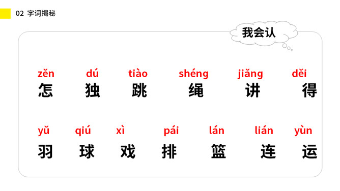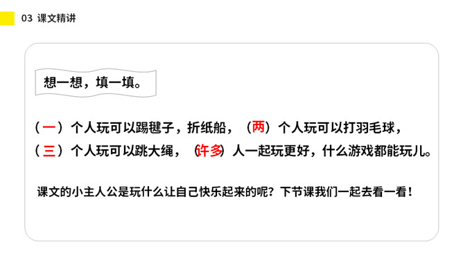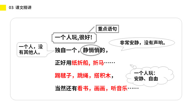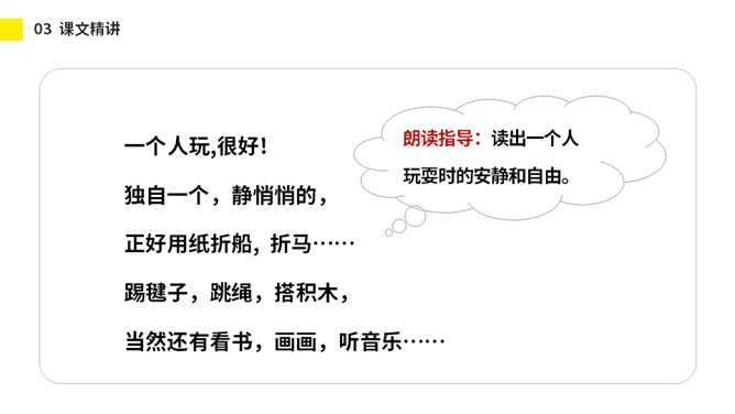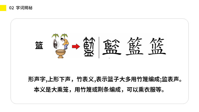 (1)不认识的字可以看拼音,或者请教老师和同学。(2)读准每一个字的字音,圈出生字词;(3)读通每个句子,读不通顺的多读几遍;(4)给每个自然段写上序号。形声字,上形下声,竹表义,表示篮子大多用竹篾编成;监表声。本义是大熏笼,用竹篾或荆条编成,可以熏衣服等。课文的小主人公是玩什么让自己快乐起来的呢?下节课我们一起去看一看!联系上文:“四个人玩”“五个人玩”可知,这句话是指比四五个人玩快乐。所属专题:怎么都快乐ppt。
