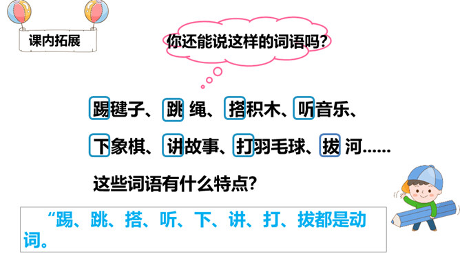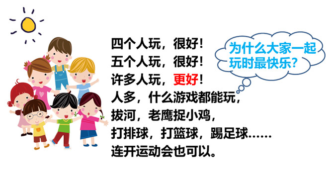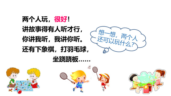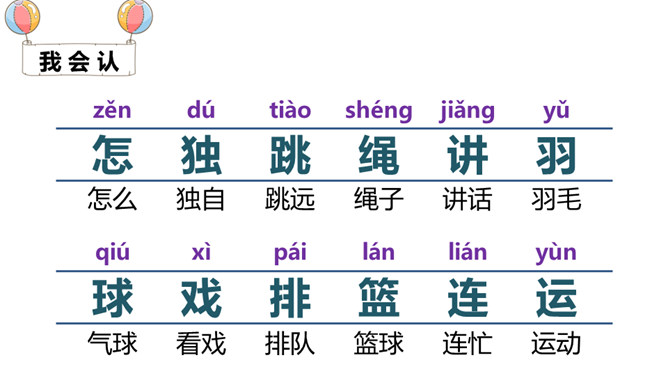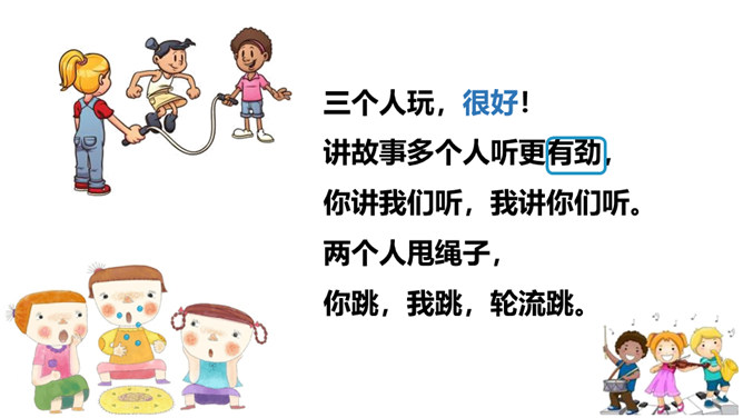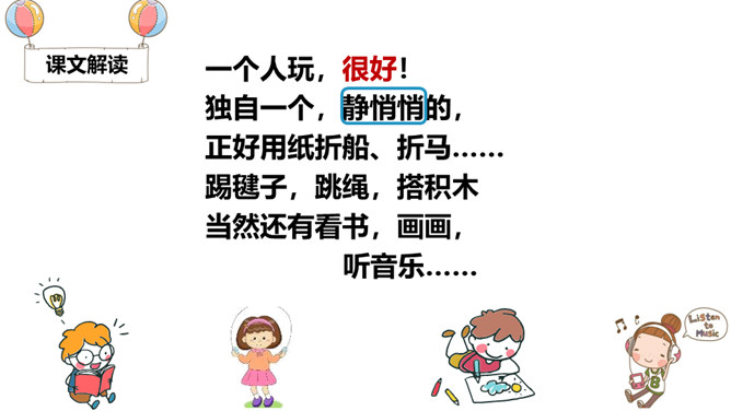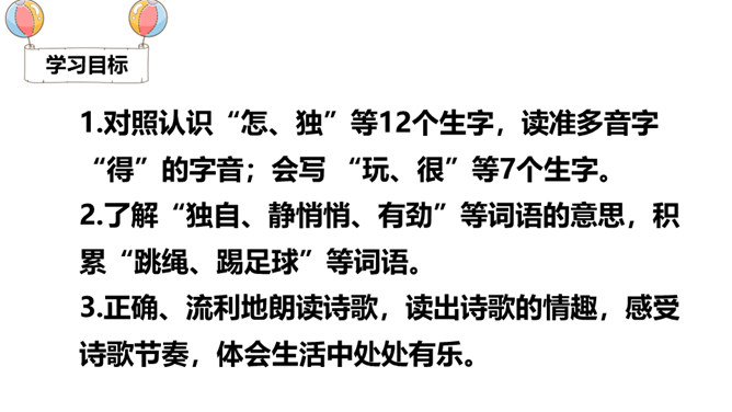 同学们,当你们一个人的时候,你们会做些什么呢?你感受到快乐了吗?两个人的时候呢?三个人?1.对照认识“怎、独”等12个生字,读准多音字“得”的字音;会写 “玩、很”等7个生字。2.了解“独自、静悄悄、有劲”等词语的意思,积累“跳绳、踢足球”等词语。3.正确、流利地朗读诗歌,读出诗歌的情趣,感受诗歌节奏,体会生活中处处有乐。听朗读,然后自己试着读一读,注意读准字音,不会的字多读几遍!所属专题:怎么都快乐ppt。