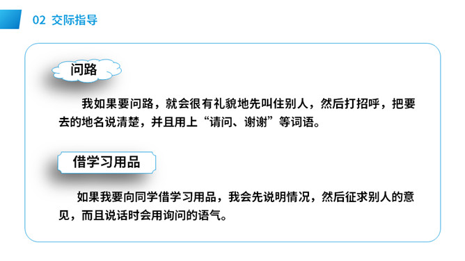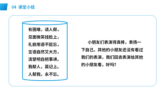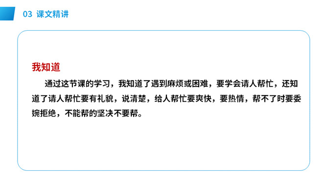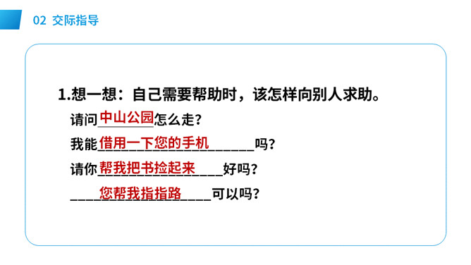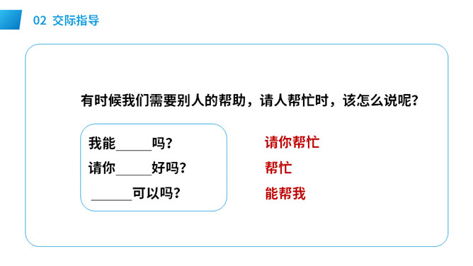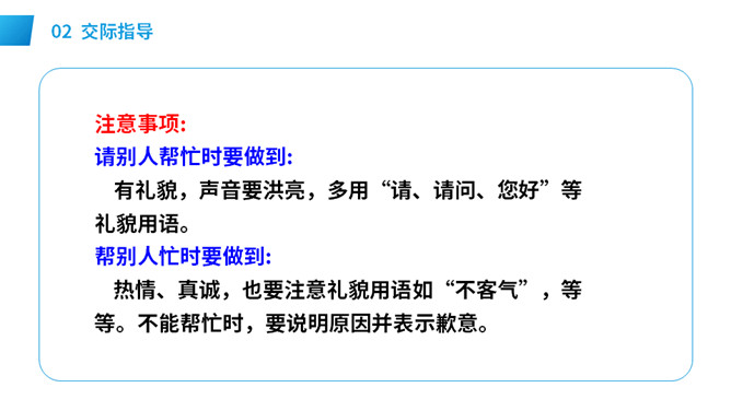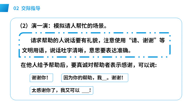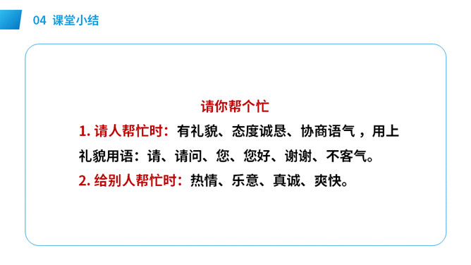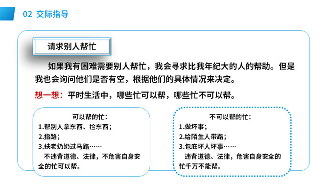 想一想:自己需要帮助时,该怎样向别人求助。演一演:模拟请人帮忙的场景。请求帮助的人说话要有礼貌,注意使用“请、谢谢”等文明用语,说话吐字清晰,意思要表达准确。在他人给予帮助后,要真诚对帮助者表示感谢,可以说:谢谢你!注意事项: 请别人帮忙时要做到:有礼貌,声音要洪亮,多用“请、请问、您好”等礼貌用语。帮别人忙时要做到:热情、真诚,也要注意礼貌用语如“不客气”,等等。不能帮忙时,要说明原因并表示歉意。所属专题:请你帮个忙ppt。