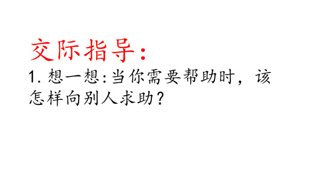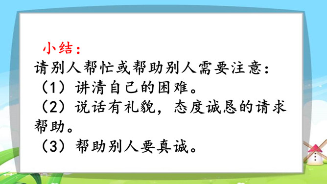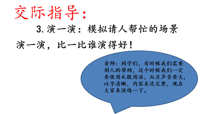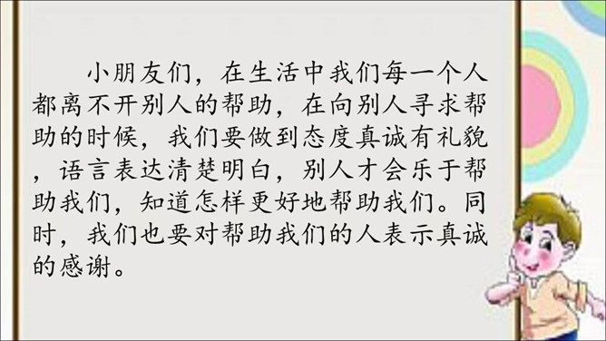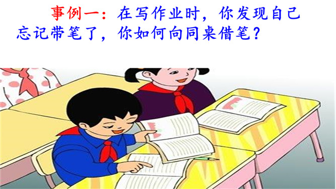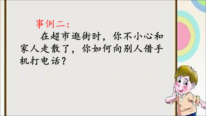 事例一:在写作业时,你发现自己忘记带笔了,你如何向同桌借笔?事例二:在超市逛街时,你不小心和家人走散了,你如何向别人借手机打电话?小朋友们,在生活中我们每一个人都离不开别人的帮助,在向别人寻求帮助的时候,我们要做到态度真诚有礼貌,语言表达清楚明白,别人才会乐于帮助我们,知道怎样更好地帮助我们。同时,我们也要对帮助我们的人表示真诚的感谢。所属专题:请你帮个忙ppt。