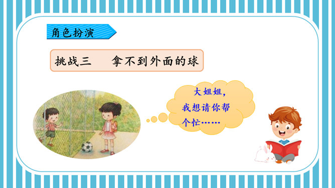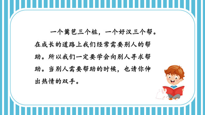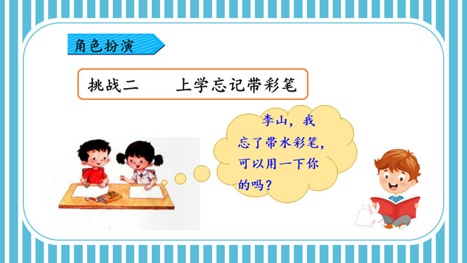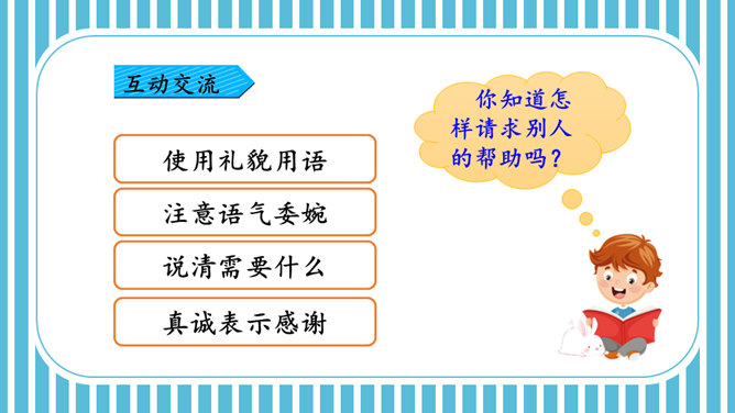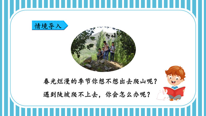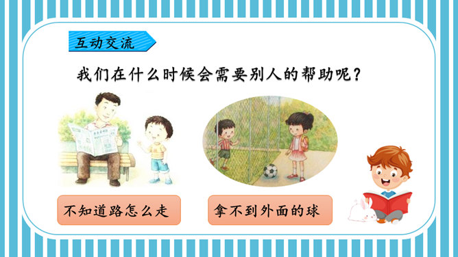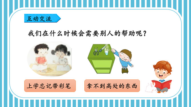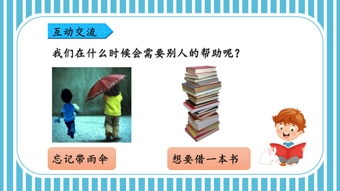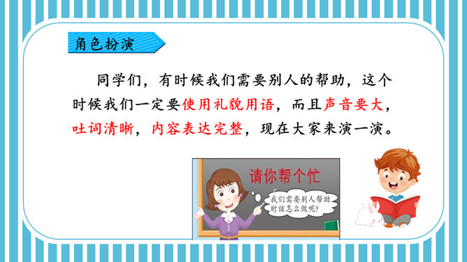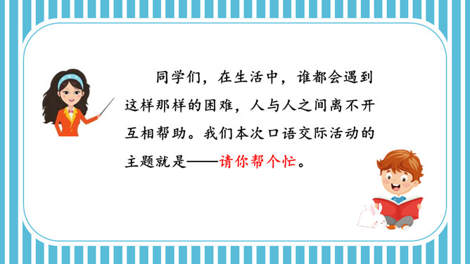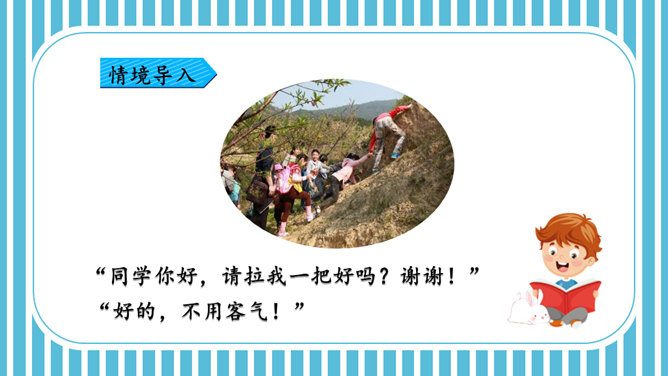 春光烂漫的季节你想不想出去爬山呢?遇到陡坡爬不上去,你会怎么办呢?“同学你好,请拉我一把好吗?谢谢!”“好的,不用客气!”同学们,在生活中,谁都会遇到这样那样的困难,人与人之间离不开互相帮助。我们本次口语交际活动的主题就是——请你帮个忙。我们在什么时候会需要别人的帮助呢?同学们,有时候我们需要别人的帮助,这个时候我们一定要使用礼貌用语,而且声音要大,吐词清晰,内容表达完整,现在大家来演一演。所属专题:请你帮个忙ppt。