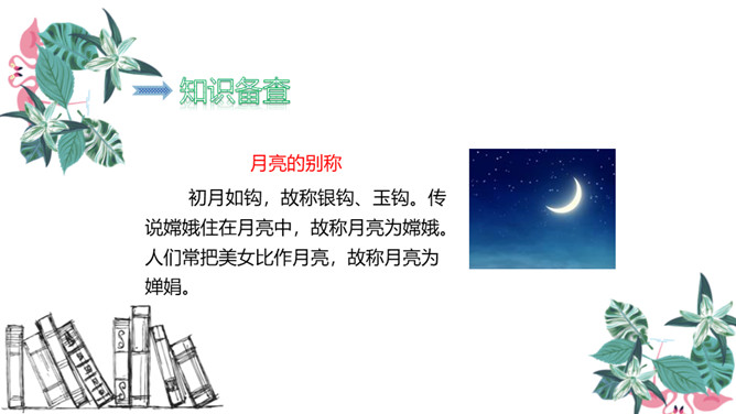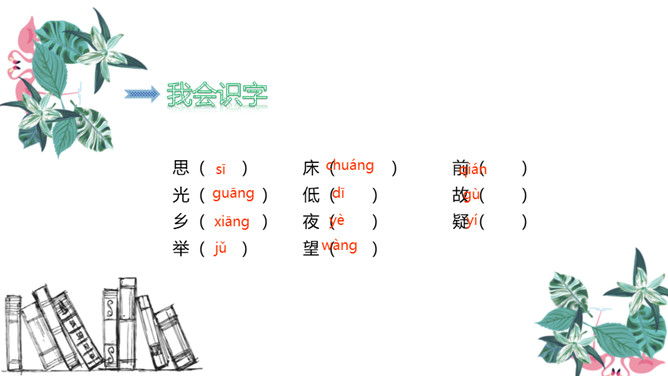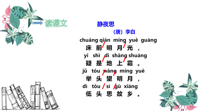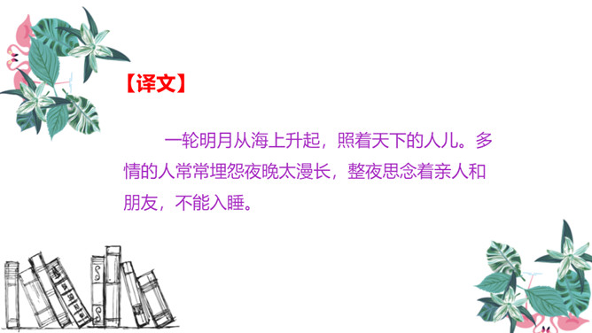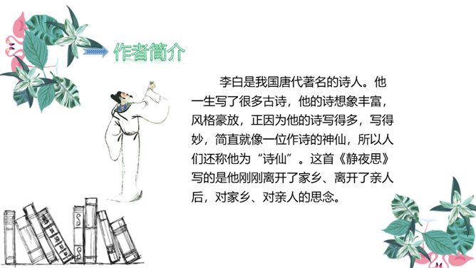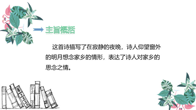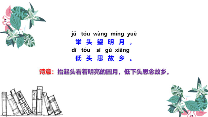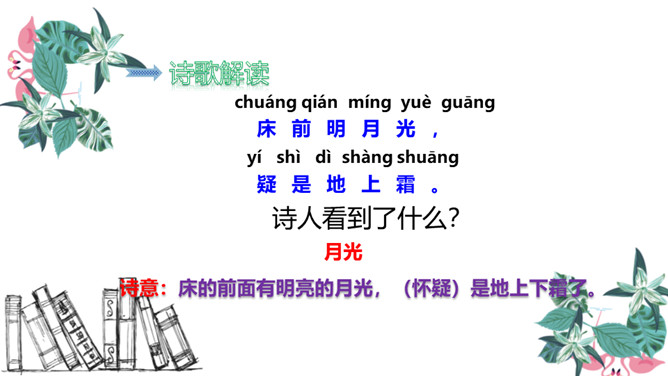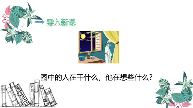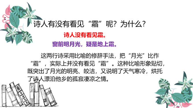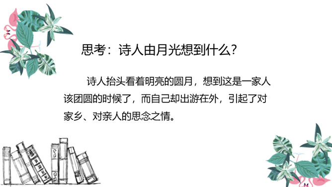 图中的人在干什么,他在想些什么?诗人有没有看见“霜”呢?为什么?这两行诗采用比喻的修辞手法,把“月光”比作“霜”,实际上并没有看见“霜”。这种比喻形象贴切,既突出了月光的明亮、皎洁,又说明了天气寒冷,烘托了诗人漂泊他乡的孤寂凄凉之情。思考:诗人由月光想到什么?诗人抬头看着明亮的圆月,想到这是一家人该团圆的时候了,而自己却出游在外,引起了对家乡、对亲人的思念之情。所属专题:静夜思ppt。