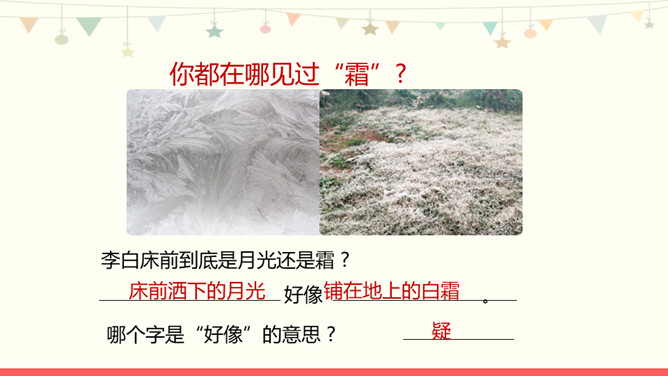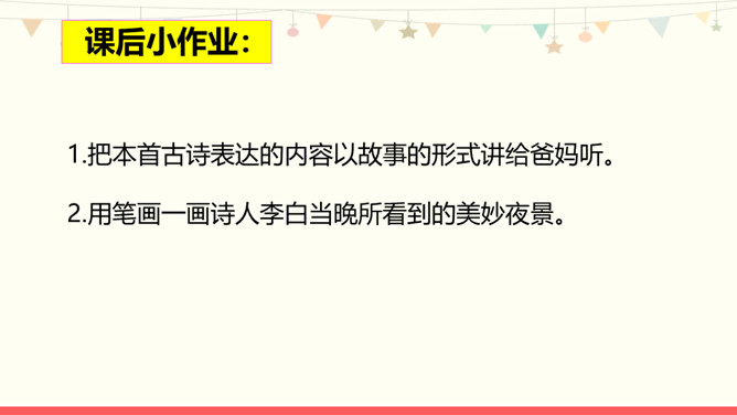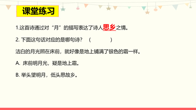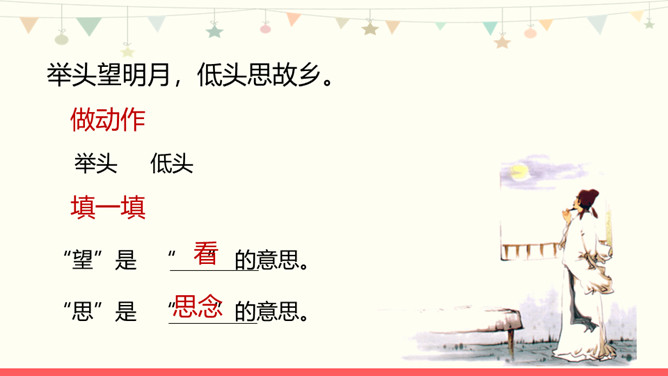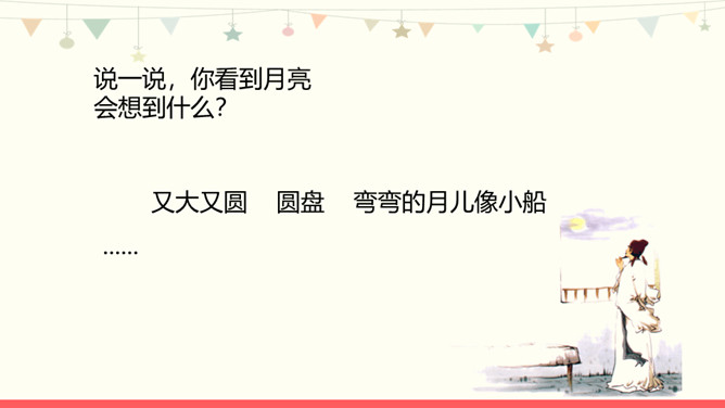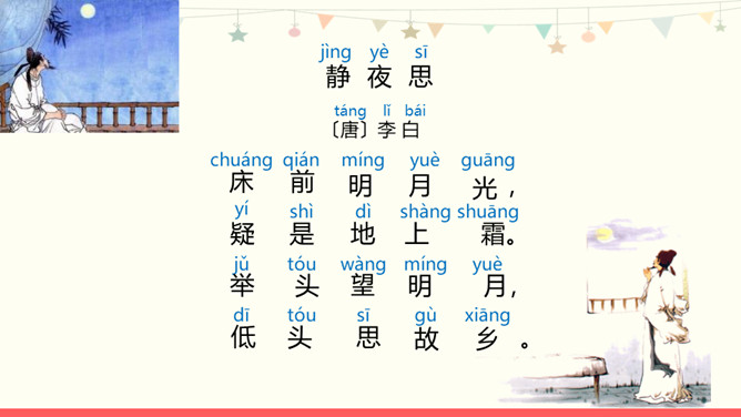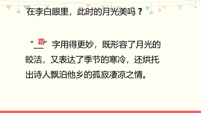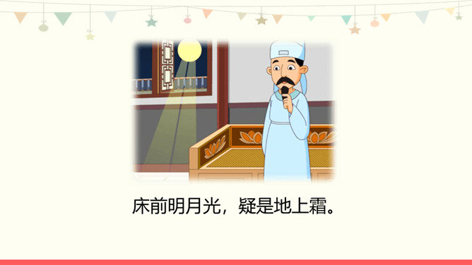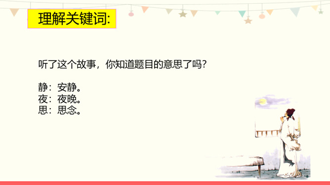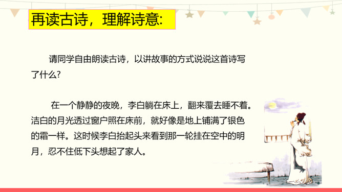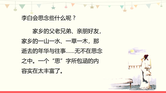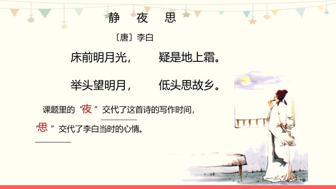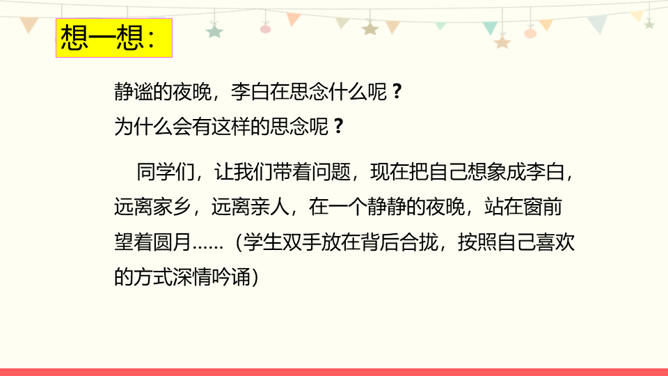 如果你离开了爸爸妈妈,十分想念他们,却无法相见,你的心情会是什么样的?(难过、伤心、悲哀……)就让我们带着这种情感再一次感受这首古诗吧!静谧的夜晚,李白在思念什么呢 ? 为什么会有这样的思念呢 ?同学们,让我们带着问题,现在把自己想象成李白,远离家乡,远离亲人,在一个静静的夜晚,站在窗前望着圆月……(学生双手放在背后合拢,按照自己喜欢的方式深情吟诵)所属专题:静夜思ppt。