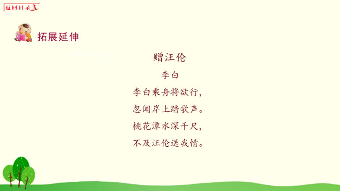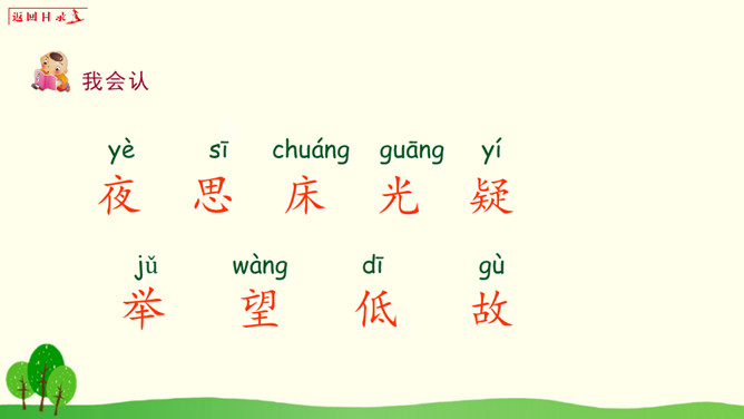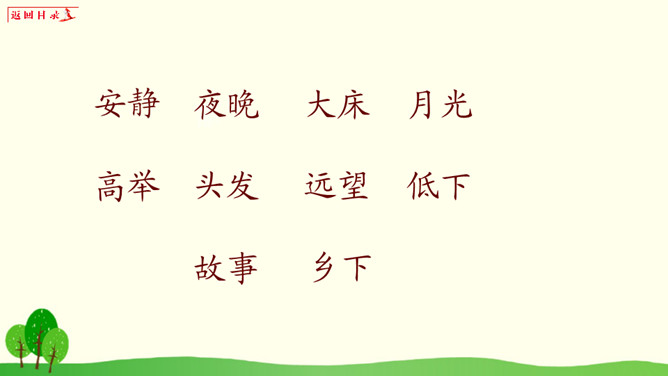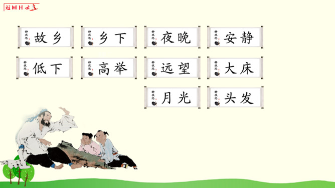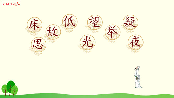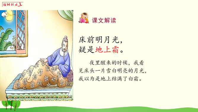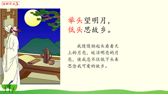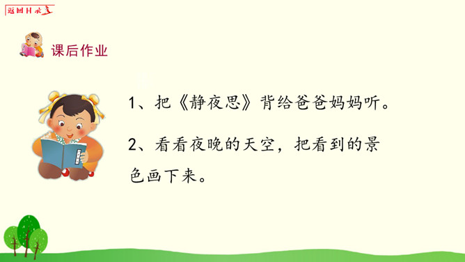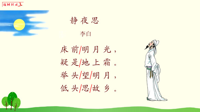 小朋友们,请你想一想:1、你有过一个人在家或者是没有爸爸妈妈的陪伴一个人在外过夜的经历吗?2、如果你一个人在窗边欣赏月亮,你会想到谁?你的心情是怎样的?1、把《静夜思》背给爸爸妈妈听。2、看看夜晚的天空,把看到的景色画下来。所属专题:静夜思ppt。