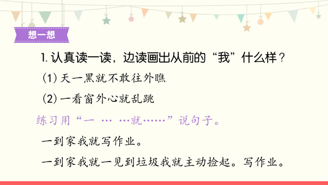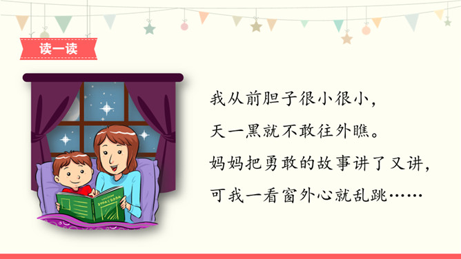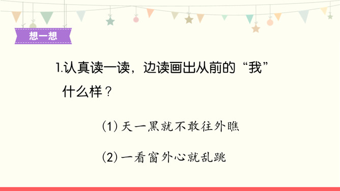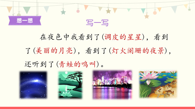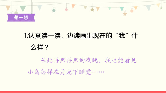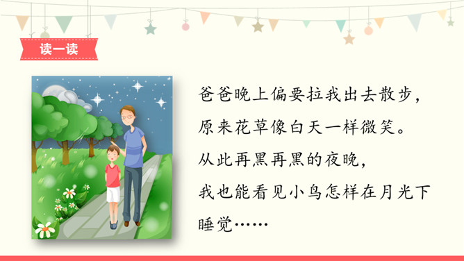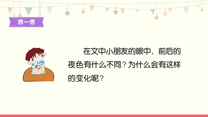在文中小朋友的眼中,前后的夜色有什么不同 ? 为什么会有这样的变化呢 ? 认真读一读,边读画出现在的“我”什么样 ?从此再黑再黑的夜晚,我也能看见小鸟怎样在月光下睡觉……你原来害怕黑夜吗?学了这首诗歌后,你会怎么做呢?你想对文中的小朋友说些什么?所属专题:夜色ppt。