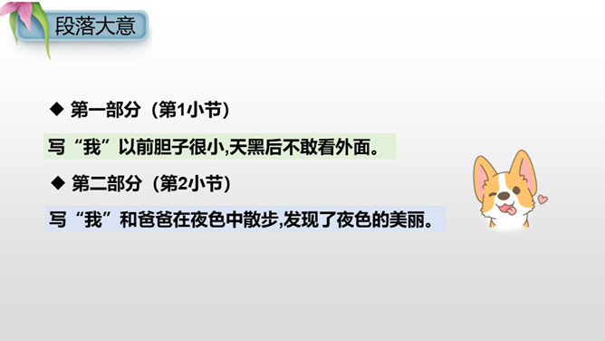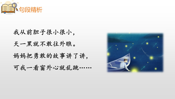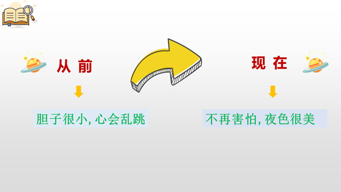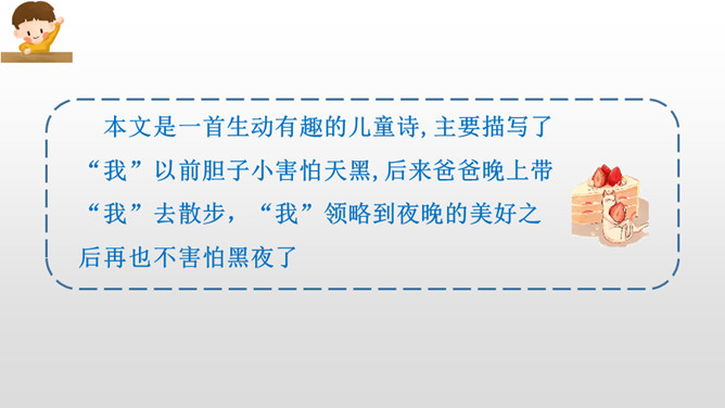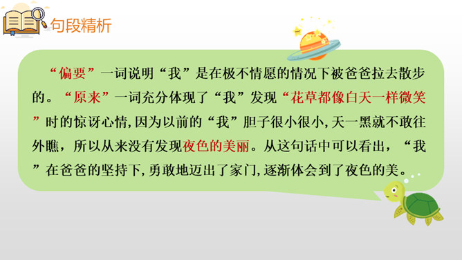 本文是一首生动有趣的儿童诗,主要描写了“我”以前胆子小害怕天黑,后来爸爸晚上带“我”去散步,“我”领略到夜晚的美好之后再也不害怕黑夜了。“偏要”一词说明“我”是在极不情愿的情况下被爸爸拉去散步的。“原来”一词充分体现了“我”发现“花草都像白天一样微笑”时的惊讶心情,因为以前的“我”胆子很小很小,天一黑就不敢往外瞧,所以从来没有发现夜色的美丽。从这句话中可以看出,“我”在爸爸的坚持下,勇敢地迈出了家门,逐渐体会到了夜色的美。小朋友们,美丽的夜色中藏着许多我们原来并不知道的小秘密,只要我们勇敢地走出去,就一-定会有惊喜。希望大家在今后的生活中更加勇敢独立,收获更多精彩的发现。所属专题:夜色ppt。