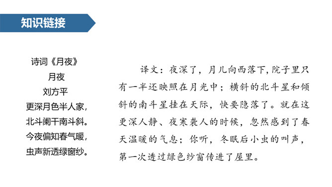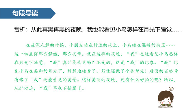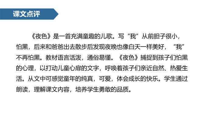 《夜色》是一首充满童趣的儿歌。写“我”从前胆子很小,怕黑,后来和爸爸出去散步后发现夜晚也像白天一样美好,“我”不再怕黑。教材语言活泼,通俗易懂。《夜色》捕捉到孩子们怕黑的心理,以打动儿童心扉的文字,呼唤着孩子们亲近自然、热爱生活。从文中可感觉童年的纯真,可爱,体会成长的快乐。学生通过朗读,理解课文内容,培养学生勇敢的品质。本文是一首儿歌,语言生动活泼,韵律欢快优美,充满了童趣。所属专题:夜色ppt。