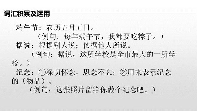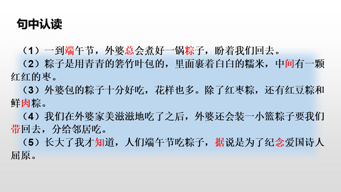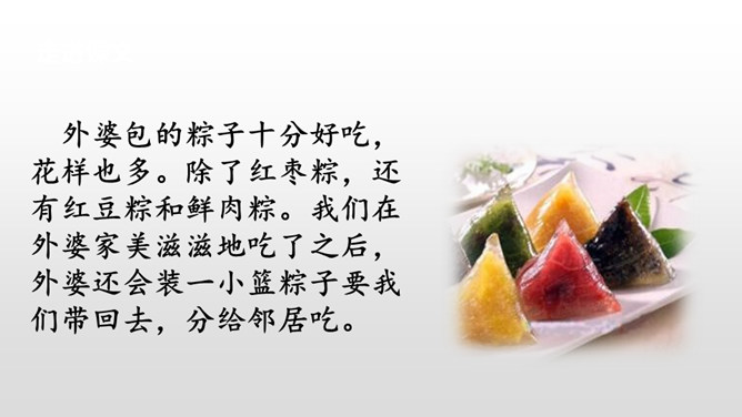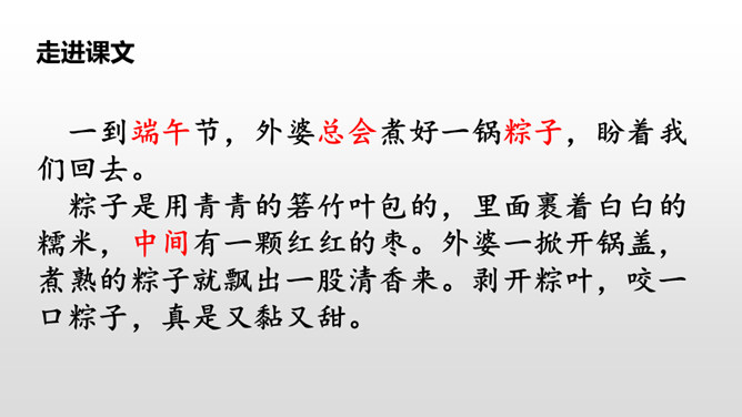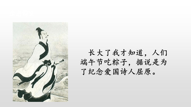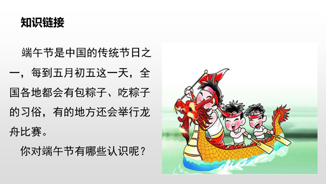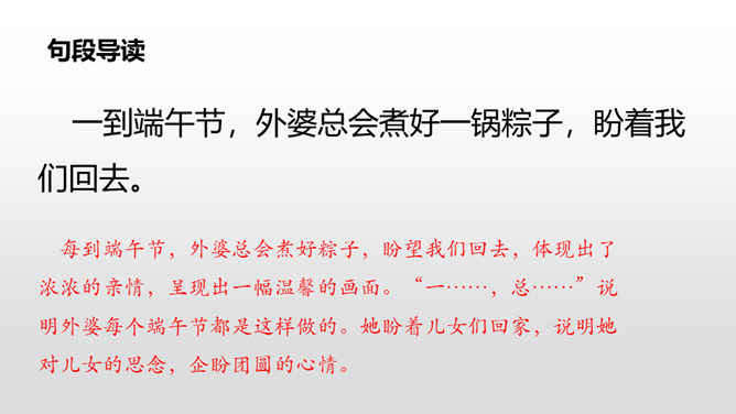 每到端午节,外婆总会煮好粽子,盼望我们回去,体现出了浓浓的亲情,呈现出一幅温馨的画面。“一……,总……”说明外婆每个端午节都是这样做的。她盼着儿女们回家,说明她对儿女的思念,企盼团圆的心情。端午节是中国的传统节日之一,每到五月初五这一天,全国各地都会有包粽子、吃粽子的习俗,有的地方还会举行龙舟比赛。你对端午节有哪些认识呢?所属专题:端午粽ppt。