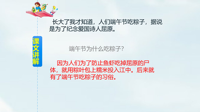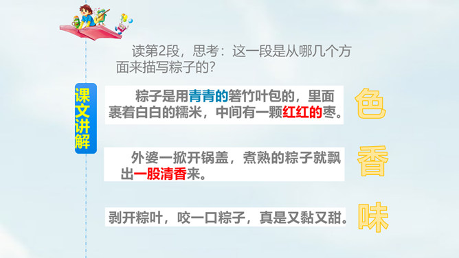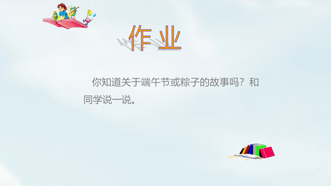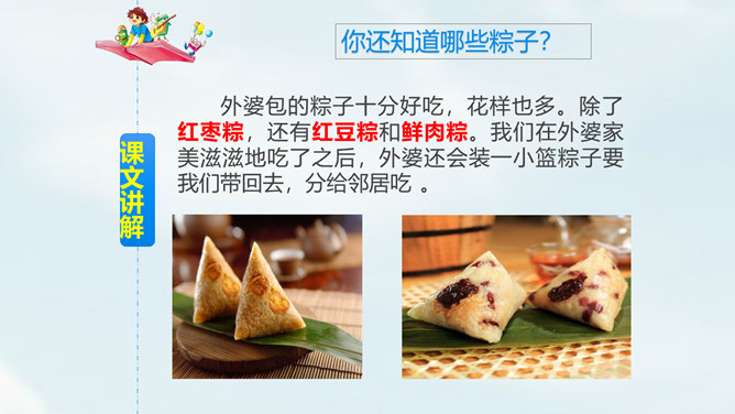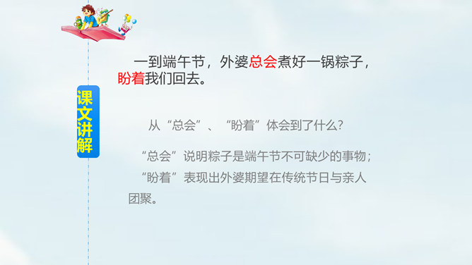 我们国家历史悠久,有很多传统节日,大家都知道哪些传统节日?端午节,为每年农历五月初五,是中国四大传统节日之一。端午习俗主要有划龙船与食粽子等。从“总会”、“盼着”体会到了什么?“总会”说明粽子是端午节不可缺少的事物;“盼着”表现出外婆期望在传统节日与亲人团聚。读第2段,思考:这一段是从哪几个方面来描写粽子的?你知道关于端午节或粽子的故事吗?和同学说一说。所属专题:端午粽ppt。
