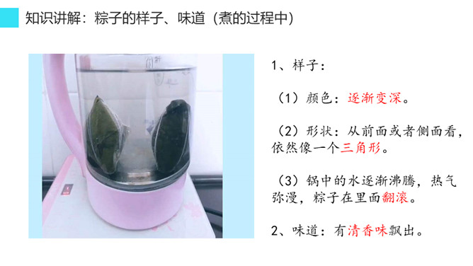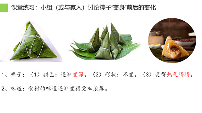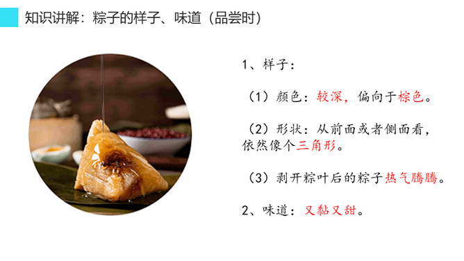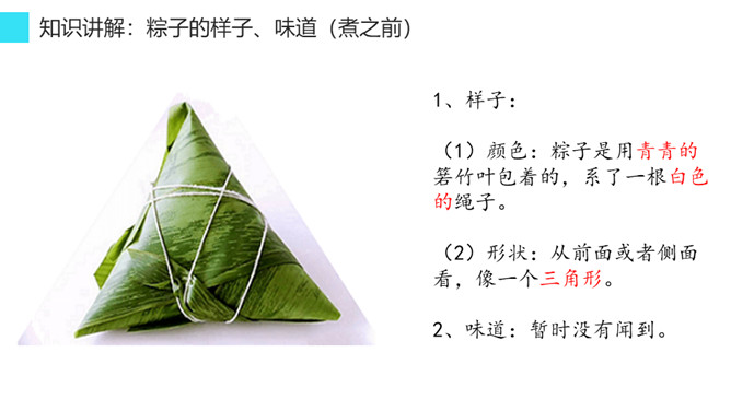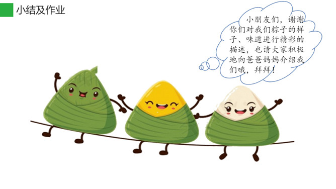 哈喽,小朋友们,端午节又到啦,我们是你们的好朋友红枣粽子呀!人们端午节吃粽子,据说是为了纪念屈原,他是一位热爱祖国的诗人,小朋友们要向他学习哦,热爱祖国,现在就要认真学习知识,长大后为祖国作贡献!小朋友们,谢谢你们对我们粽子的样子、味道进行精彩的描述,也请大家积极地向爸爸妈妈介绍我们哦,拜拜!所属专题:端午粽ppt。