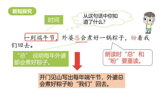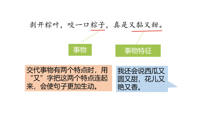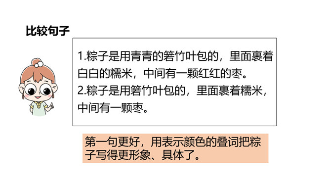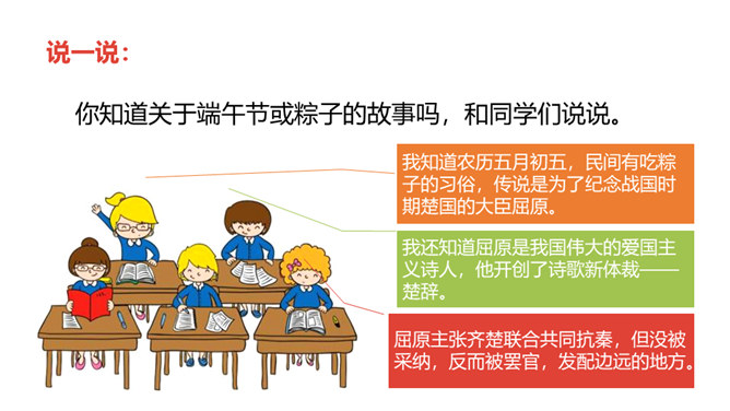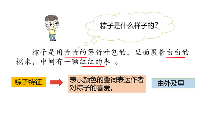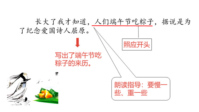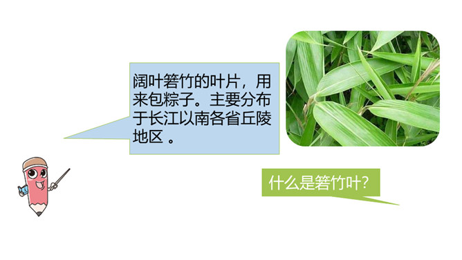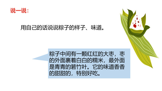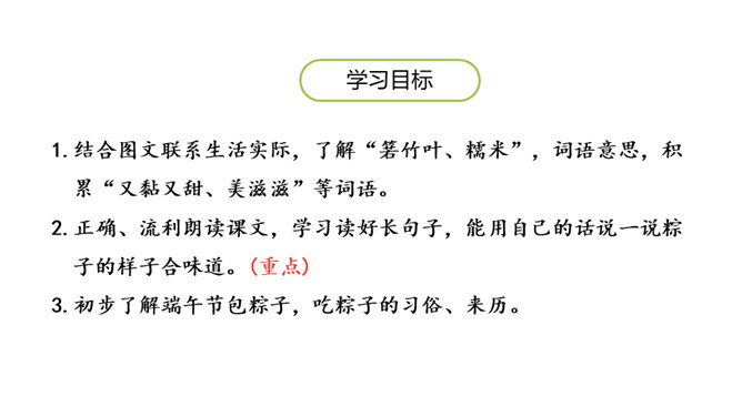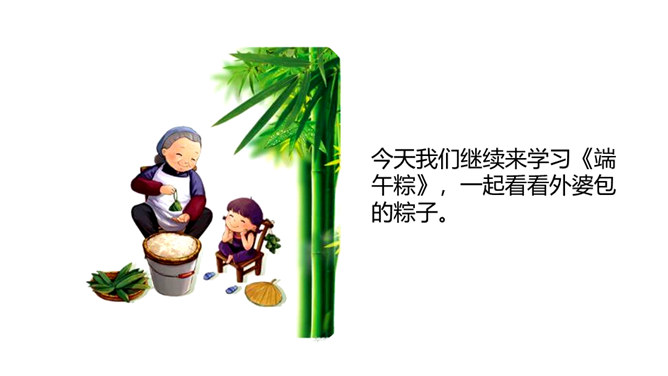 结合图文联系生活实际,了解“箬竹叶、糯米”,词语意思,积累“又黏又甜、美滋滋”等词语。正确、流利朗读课文,学习读好长句子,能用自己的话说一说粽子的样子合味道。(重点)初步了解端午节包粽子,吃粽子的习俗、来历。今天我们继续来学习《端午粽》,一起看看外婆包的粽子。 “总” 说明每年外婆都会煮好粽子。朗读时“总”和“盼”要重读。开门见山写出每年端午节,外婆总会煮好粽子盼“我们”回去。所属专题:端午粽ppt。