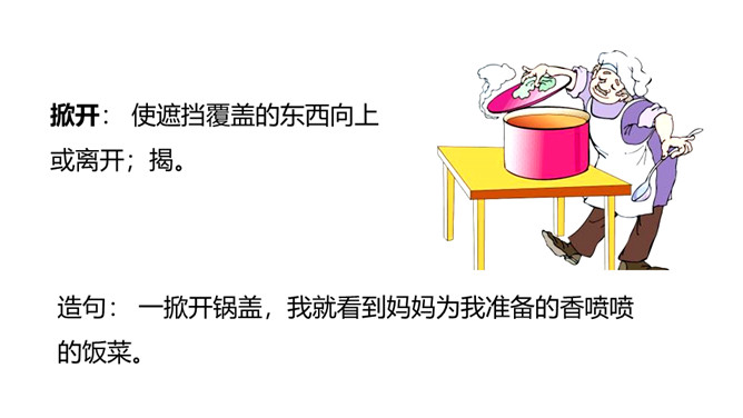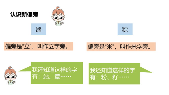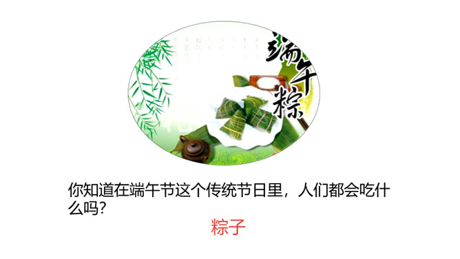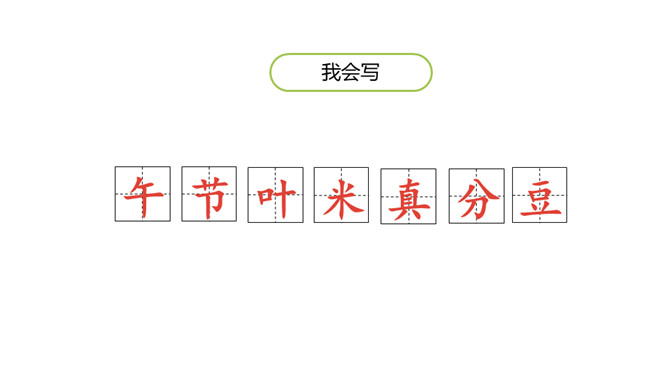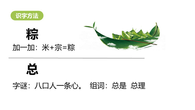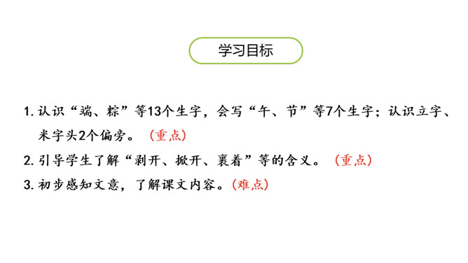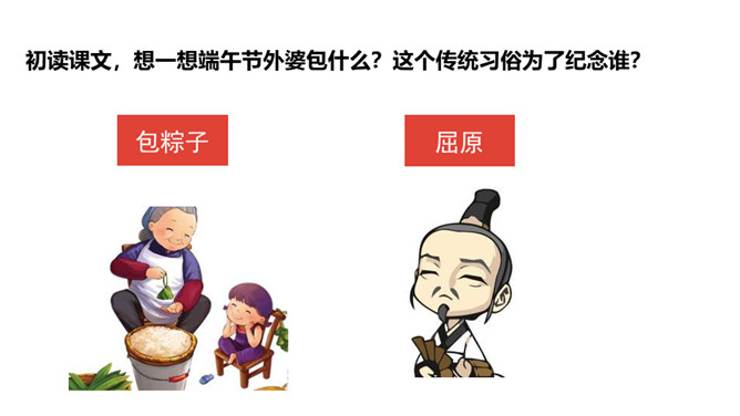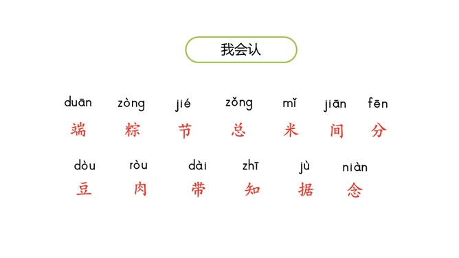 认识“端、粽”等13个生字,会写“午、节”等7个生字;认识立字、米字头2个偏旁。 (重点)引导学生了解“剥开、掀开、裹着”等的含义。 (重点)初步感知文意,了解课文内容。(难点)你知道在端午节这个传统节日里,人们都会吃什么吗?裹着:(用纸、布或其他片状物)缠绕;包扎。造句:饺子皮中间裹着鲜嫩的馅儿。掀开: 使遮挡覆盖的东西向上或离开;揭。造句: 一掀开锅盖,我就看到妈妈为我准备的香喷喷的饭菜。所属专题:端午粽ppt。
