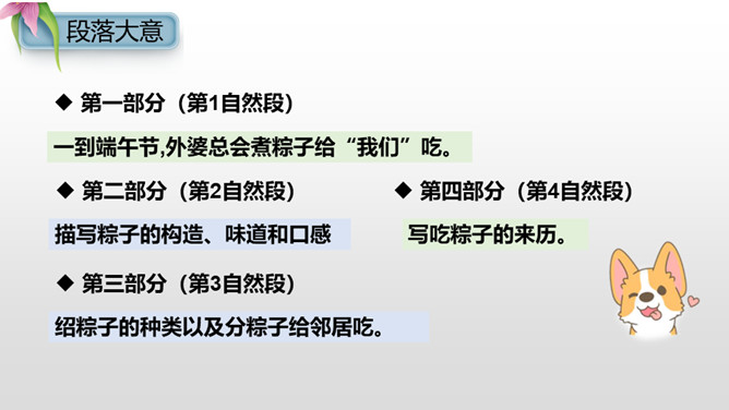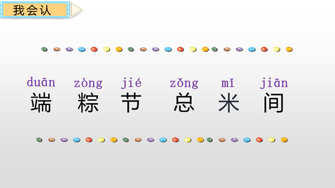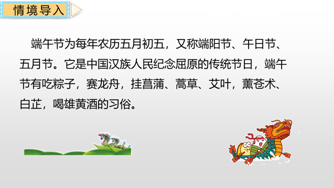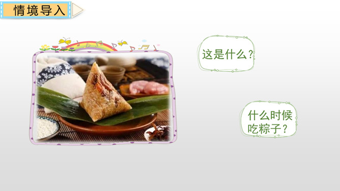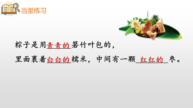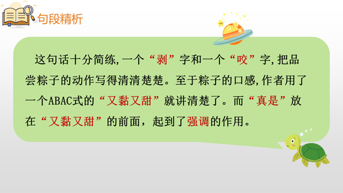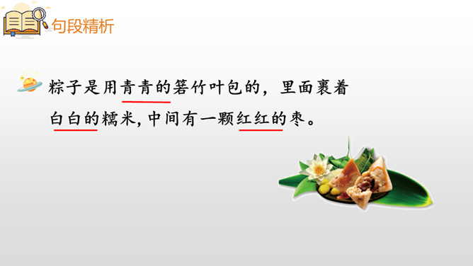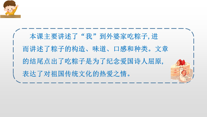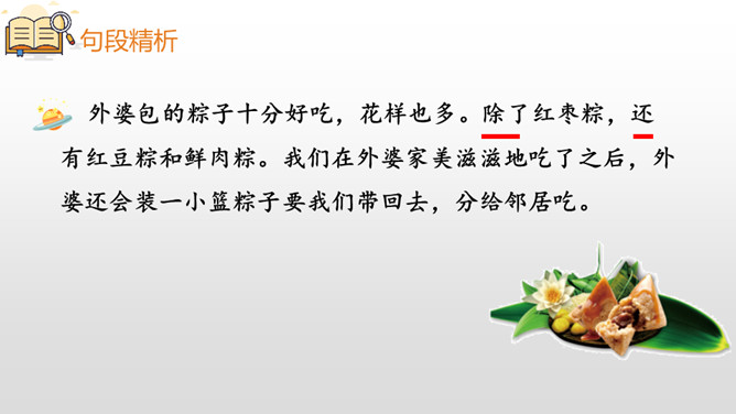 本课主要讲述了“我”到外婆家吃粽子,进而讲述了粽子的构造、味道、口感和种类。文章的结尾点出了吃粽子是为了纪念爱国诗人屈原,表达了对祖国传统文化的热爱之情。这句话十分简练,一个“剥”字和一个“咬”字,把品尝粽子的动作写得清清楚楚。至于粽子的口感,作者用了一个ABAC式的“又黏又甜”就讲清楚了。而“真是”放在“又黏又甜”的前面,起到了强调的作用。同学们,学习了这节课,我们知道了端午节吃粽子的习俗是为了纪念爱国诗人屈原,还用“文字”感受了粽子的色、香、味。所属专题:端午粽ppt。