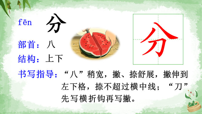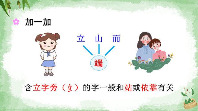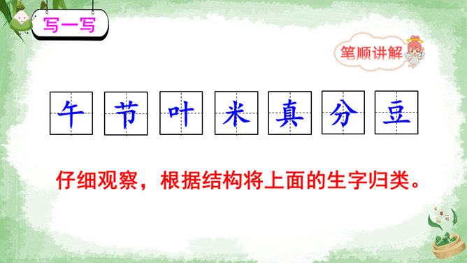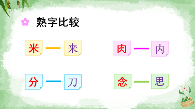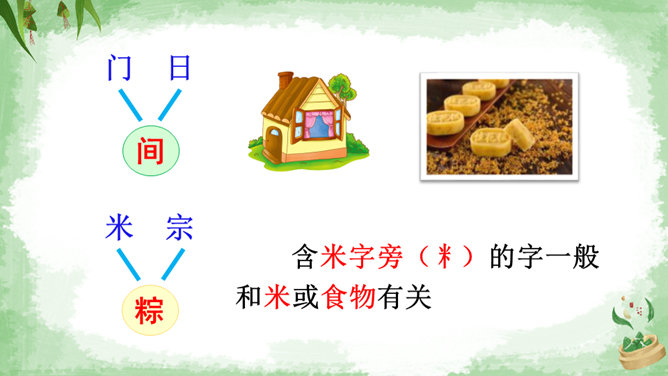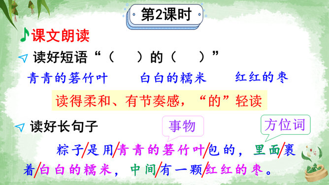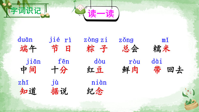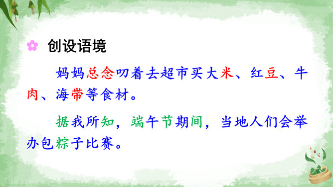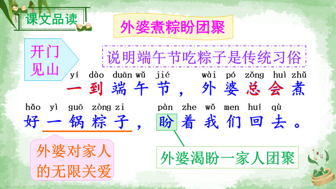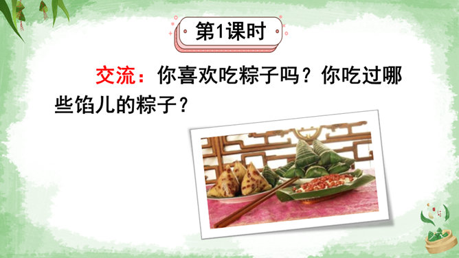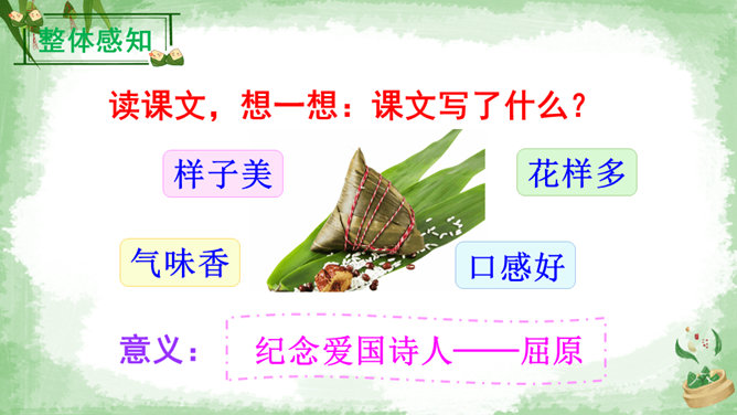 交流:你喜欢吃粽子吗?你吃过哪些馅儿的粽子?本文叙述了“我”端午节回外婆家吃粽子的事,告诉我们这一习俗是为了纪念爱国诗人屈原,引导我们更深入地了解、热爱中华的传统文化。朗读指导:本文朗读的情感基调是明快的,要读出对粽子的喜爱和对屈原的敬仰。在读长句子时,我们可以采用“内容分解法”,即理解句子中要表达的内容,思考作者在这句话中要表达什么,是从哪几个方面来说的。理解句子的意思,再把相关的词语连在一起,并且注意停顿,就能读好长句子了。所属专题:端午粽ppt。