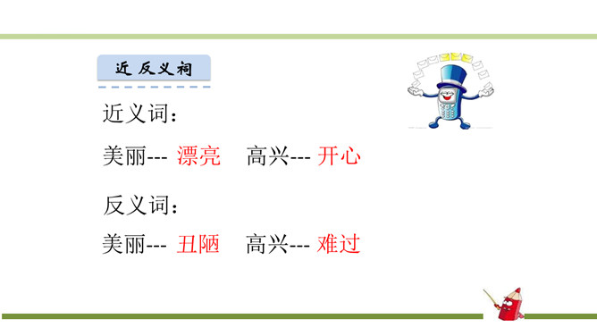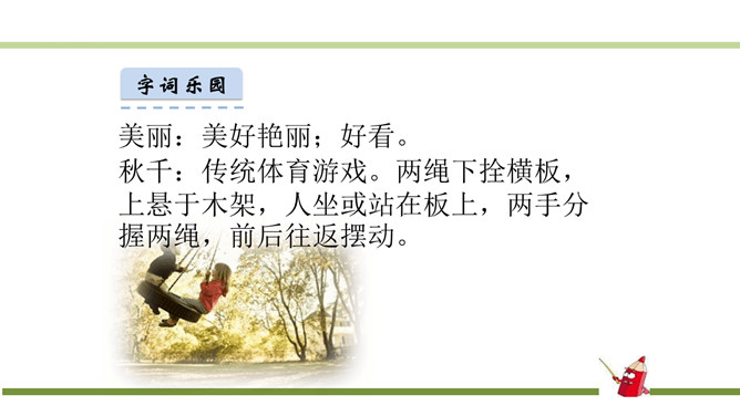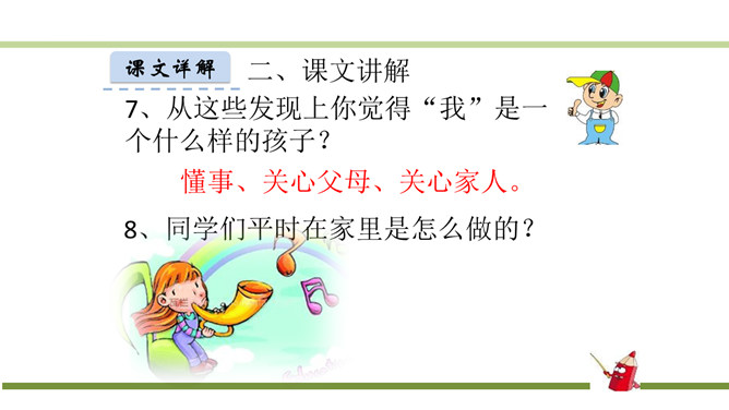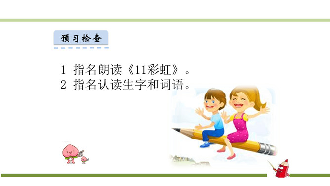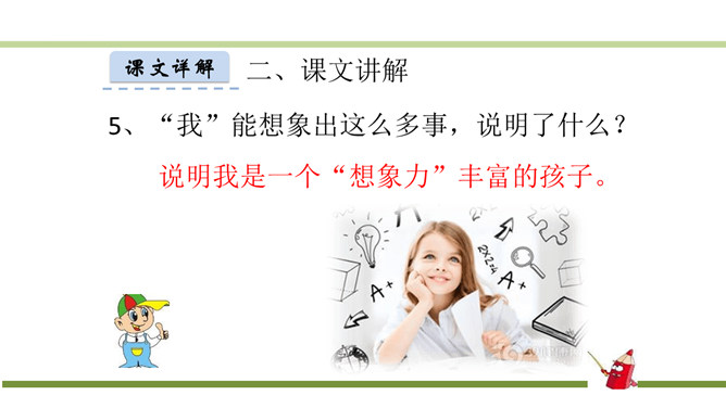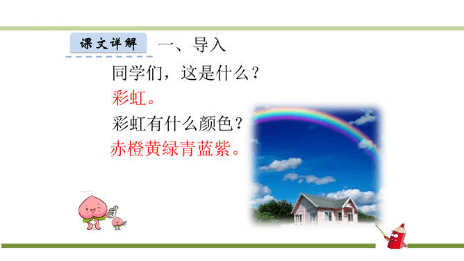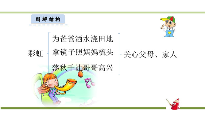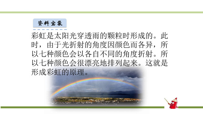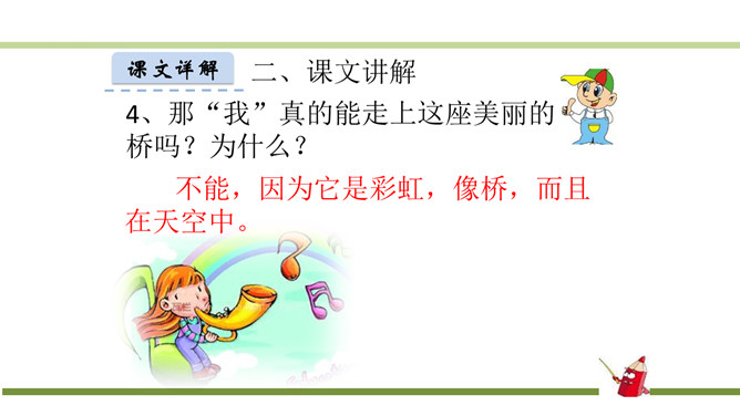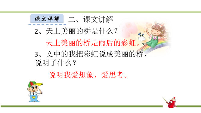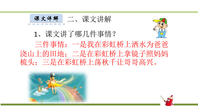 课文讲了哪几件事情?三件事情:一是我在彩虹桥上洒水为爸爸浇山上的田地;二是在彩虹桥上拿镜子照妈妈梳头;三是在彩虹桥上荡秋千让哥哥高兴。天上美丽的桥是什么?天上美丽的桥是雨后的彩虹。文中的我把彩虹说成美丽的桥,说明了什么?说明我爱想象、爱思考。那“我”真的能走上这座美丽的桥吗?为什么?不能,因为它是彩虹,像桥,而且在天空中。“我”能想象出这么多事,说明了什么?所属专题:彩虹ppt。