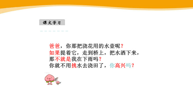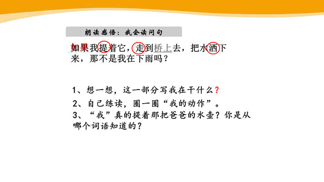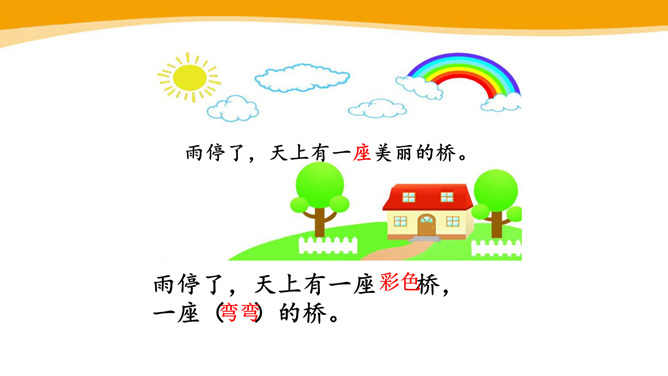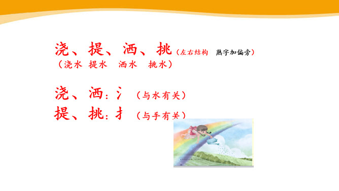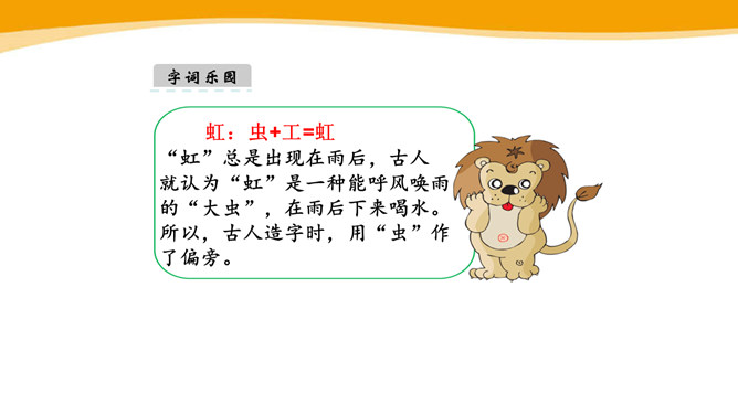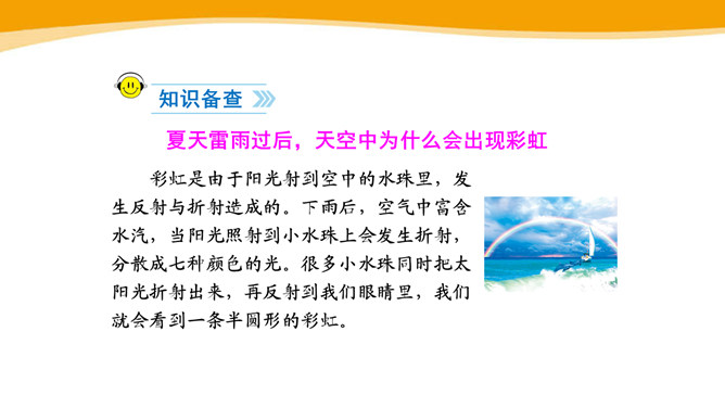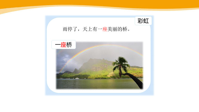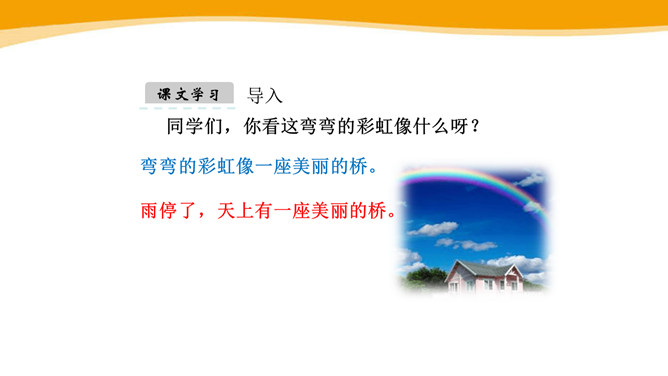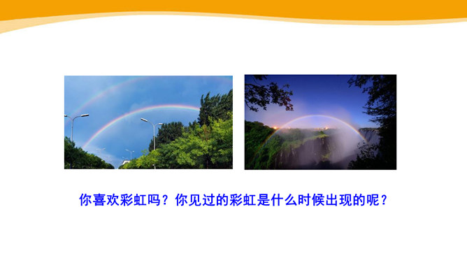你见过彩虹吗?你喜欢彩虹吗?你见过的彩虹是什么时候出现的呢?“虹”总是出现在雨后,古人就认为“虹”是一种能呼风唤雨的“大虫”,在雨后下来喝水。所以,古人造字时,用“虫”作了偏旁。同学们,你看这弯弯的彩虹像什么呀?弯弯的彩虹像一座美丽的桥。想一想,这一部分写我在干什么?自己练读,圈一圈“我的动作”。“我”真的提着那把爸爸的水壶?你是从哪个词语知道的?所属专题:彩虹ppt。