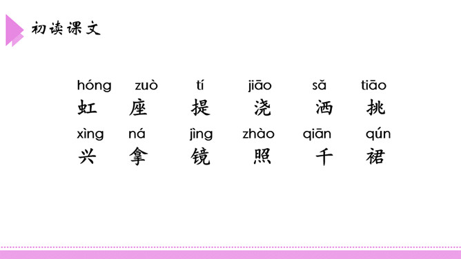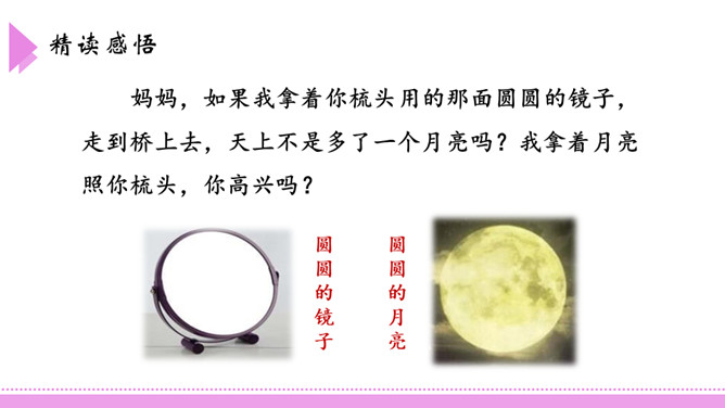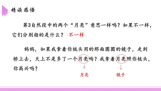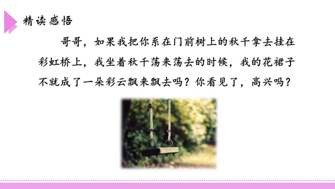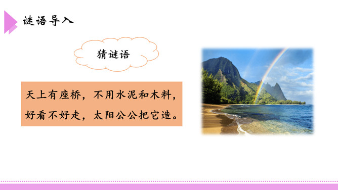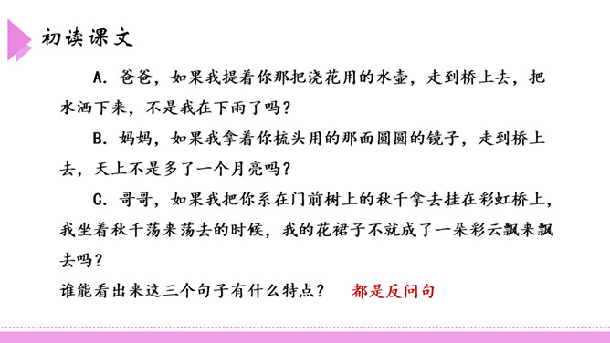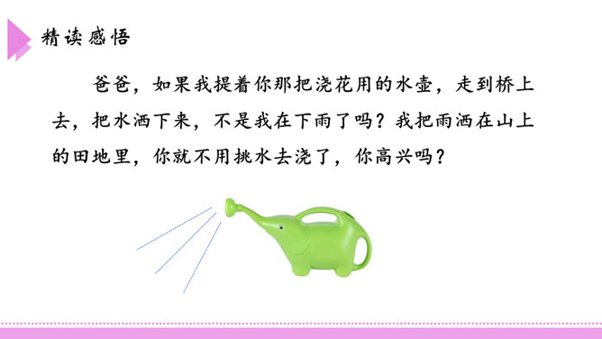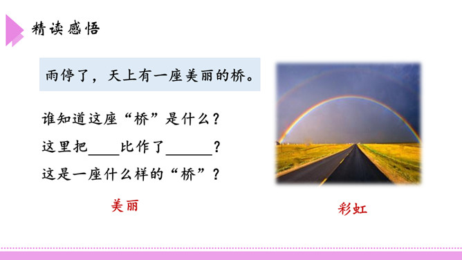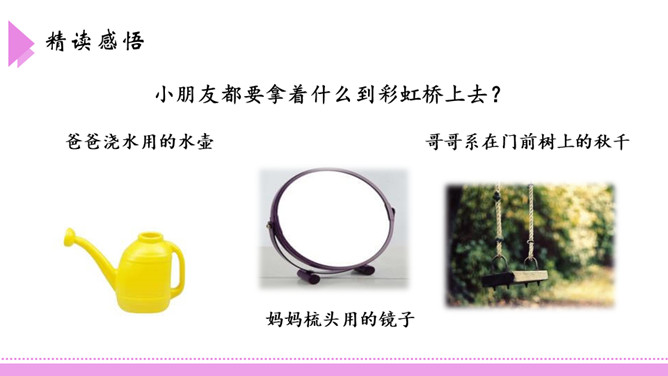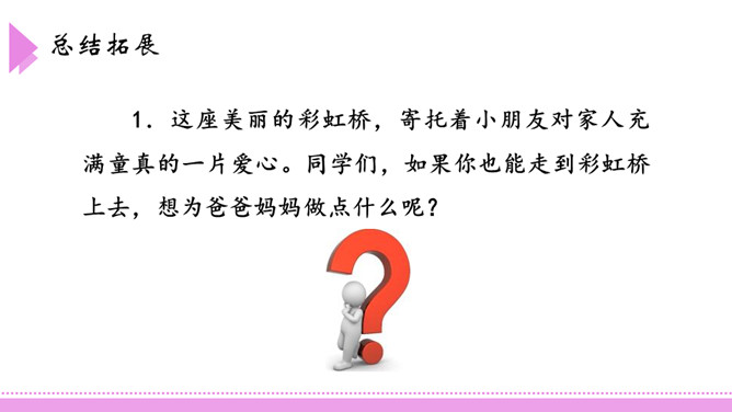爸爸,如果我提着你那把浇花用的水壶,走到桥上去,把水洒下来,不是我在下雨了吗?我把雨洒在山上的田地里,你就不用挑水去浇了,你高兴吗?这座美丽的彩虹桥,寄托着小朋友对家人充满童真的一片爱心。同学们,如果你也能走到彩虹桥上去,想为爸爸妈妈做点什么呢?口语表达:模仿2、3、4自然段,以“妹妹”开头,说一段话。第3自然段中的两个“月亮”意思一样吗?如果不一样,它们分别指的是什么?所属专题:彩虹ppt。