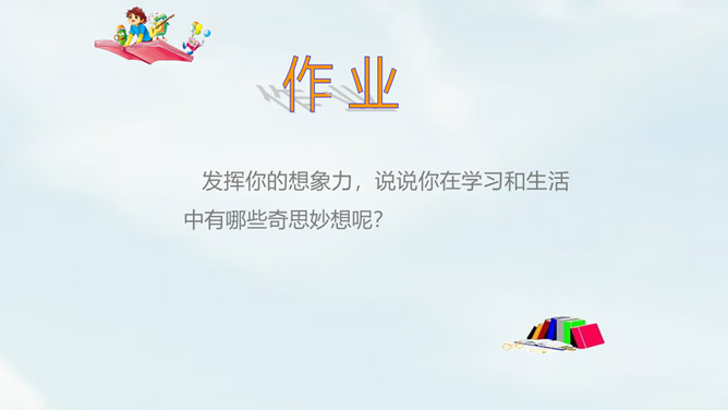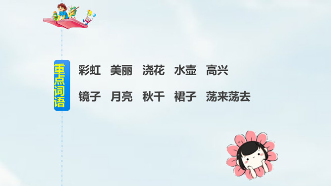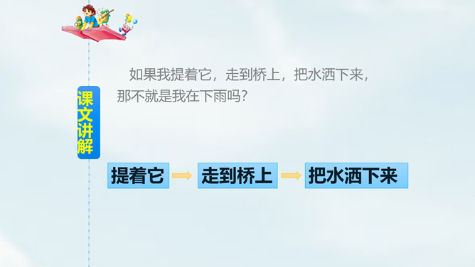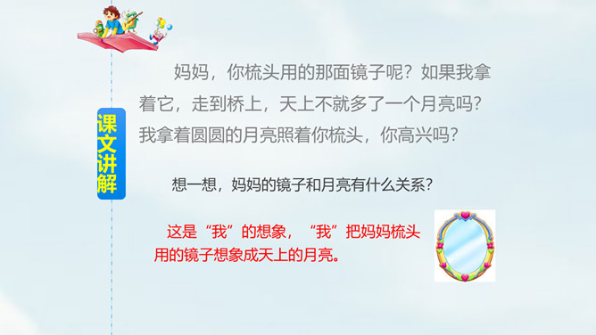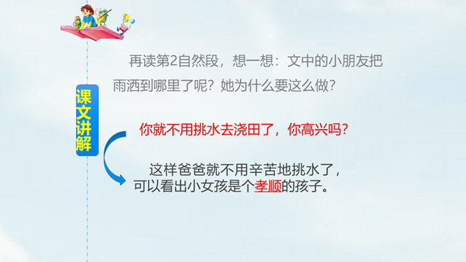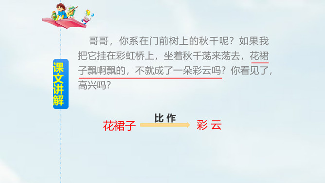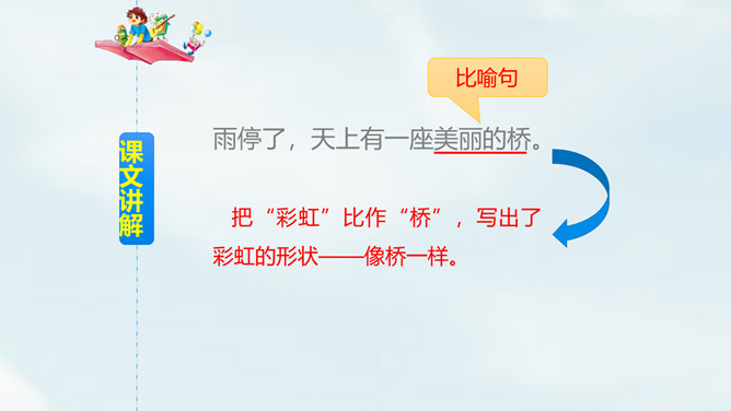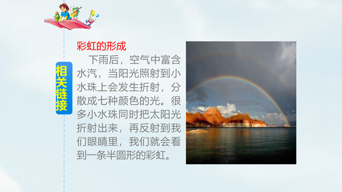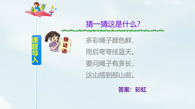 把“彩虹”比作“桥”,写出了彩虹的形状——像桥一样。 再读第2自然段,想一想:文中的小朋友把雨洒到哪里了呢?她为什么要这么做?这样爸爸就不用辛苦地挑水了,可以看出小女孩是个孝顺的孩子。想一想,妈妈的镜子和月亮有什么关系?这是“我”的想象,“我”把妈妈梳头用的镜子想象成天上的月亮。发挥你的想象力,说说你在学习和生活中有哪些奇思妙想呢?所属专题:彩虹ppt。