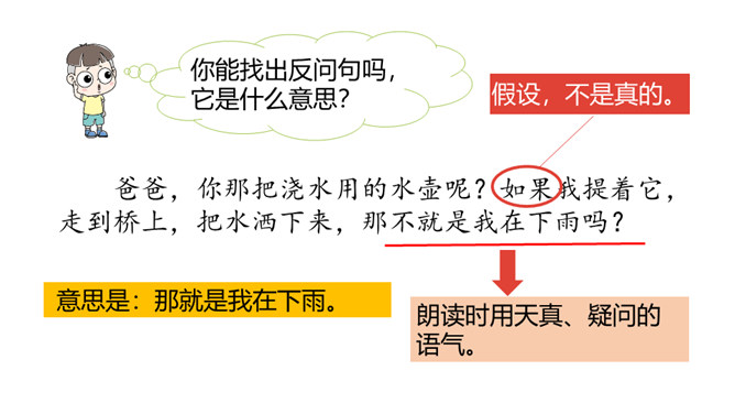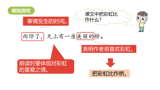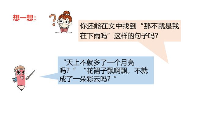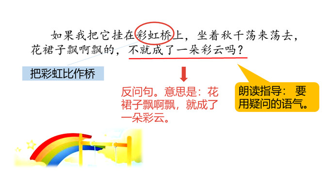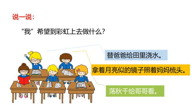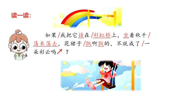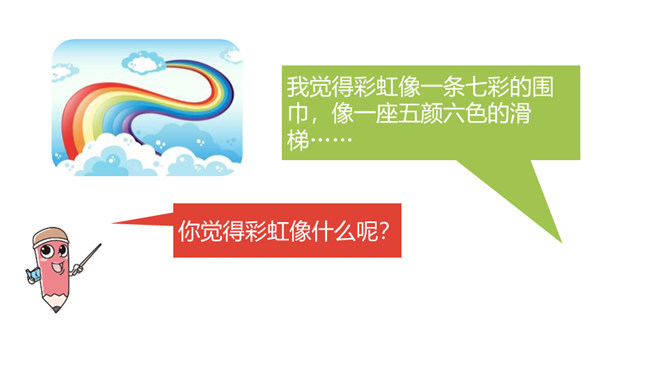 1.正确朗读课文,注意分句间的停顿,试着读出分句的语气。 (重点)2.感受纯真的想象世界,体会关心家人的美好情感。通过上节课的学习,我们已经和彩虹交上了朋友,这节课我们继续和彩虹在一起。 你还能在文中找到“那不就是我在下雨吗”这样的句子吗?“我”能想到帮助妈妈,说明“我”很懂事,关心家人。朗读时要用疑问的语气,语调要高一些。你能试着用“圆圆的”进行词语搭配吗?所属专题:彩虹ppt。