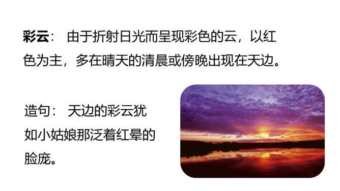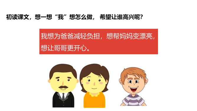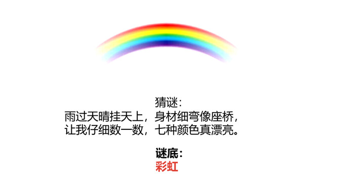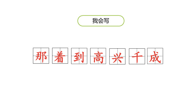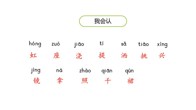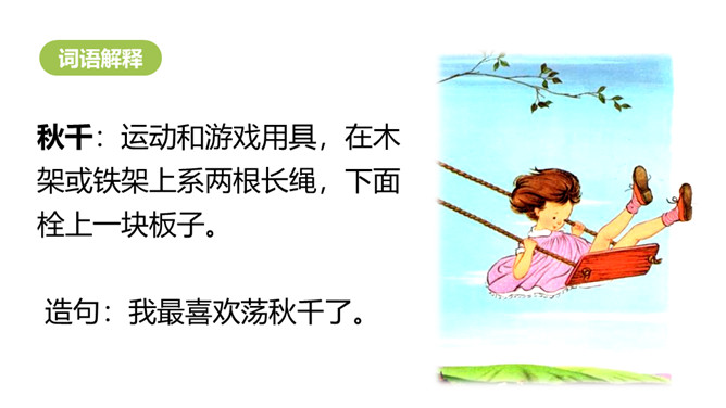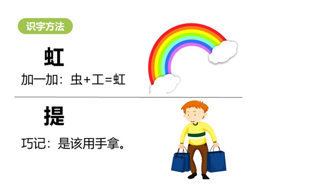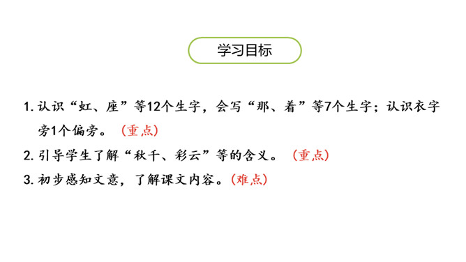 1.认识“虹、座”等12个生字,会写“那、着”等7个生字;认识衣字旁1个偏旁。 (重点)2.引导学生了解“秋千、彩云”等的含义。 (重点)3.初步感知文意,了解课文内容。(难点)初读课文,想一想“我”想怎么做, 希望让谁高兴呢?我想为爸爸减轻负担,想帮妈妈变漂亮,想让哥哥更开心。秋千:运动和游戏用具,在木架或铁架上系两根长绳,下面栓上一块板子。造句:我最喜欢荡秋千了。所属专题:彩虹ppt。