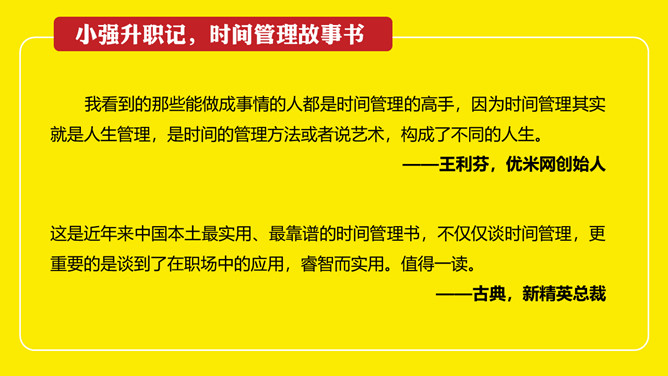 《小强升职记》读书笔记PPT。时间管理根本不是一种方法或者技能,时间管理是一种习惯,一种生活方式!