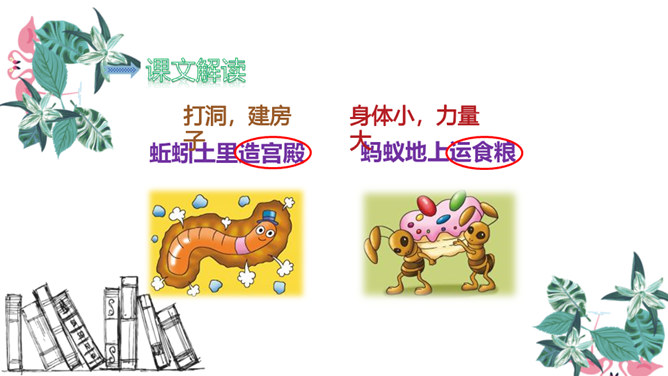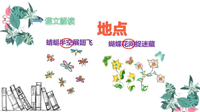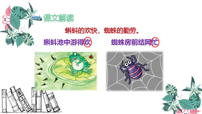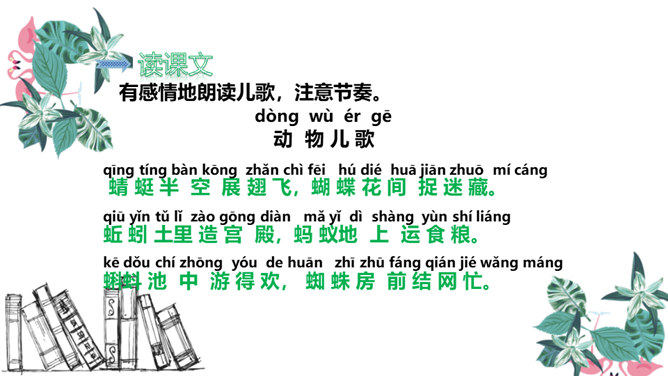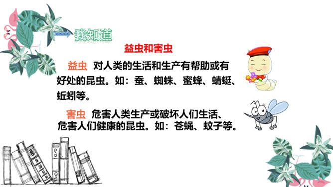 有感情地朗读儿歌,注意节奏。读完儿歌,请想一想:儿歌中一共出现了几种小动物?它们在夏天分别忙着干什么?课后作业:1.有感情地朗读儿歌。2.默写生字词。益虫 对人类的生活和生产有帮助或有好处的昆虫。如:蚕、蜘蛛、蜜蜂、蜻蜓、蚯蚓等。害虫 危害人类生产或破坏人们生活、危害人们健康的昆虫。如:苍蝇、蚊子等。所属专题:动物儿歌ppt。