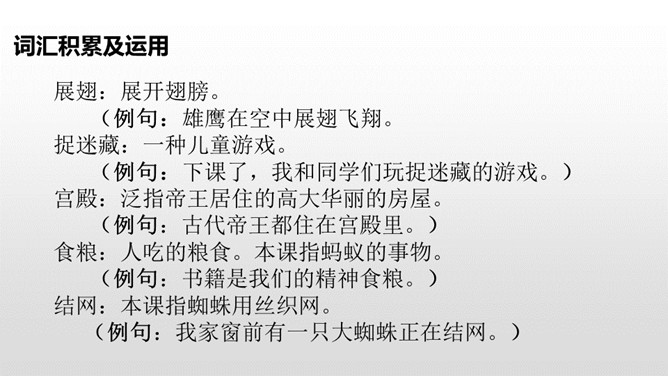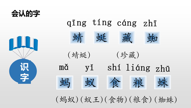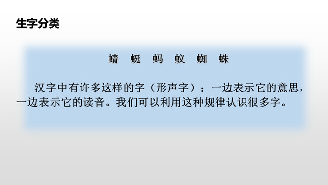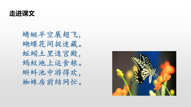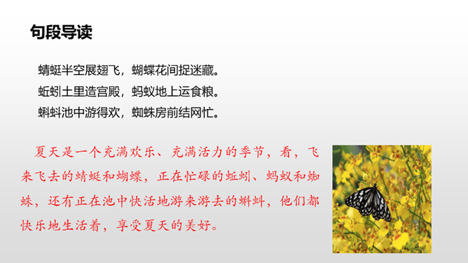 看图想一想:图上画的是什么地方?有哪些小动物?它们在干什么?汉字中有许多这样的字(形声字):一边表示它的意思,一边表示它的读音。我们可以利用这种规律认识很多字。夏天是一个充满欢乐、充满活力的季节,看,飞来飞去的蜻蜓和蝴蝶,正在忙碌的蚯蚓、蚂蚁和蜘蛛,还有正在池中快活地游来游去的蝌蚪,他们都快乐地生活着,享受夏天的美好。金鱼的肚皮是什么样的?所属专题:动物儿歌ppt。