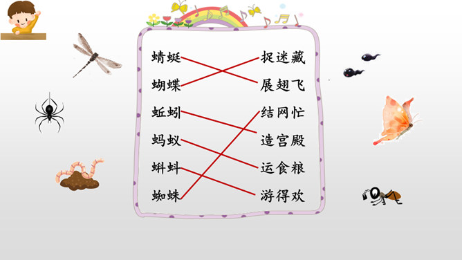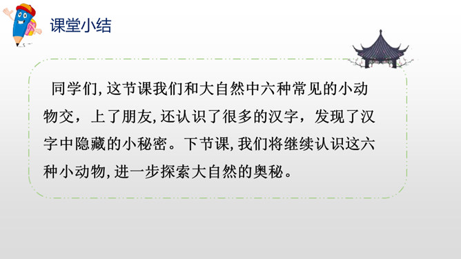 同学们,这节课我们和大自然中六种常见的小动物交,上了朋友,还认识了很多的汉字,发现了汉字中隐藏的小秘密。下节课,我们将继续认识这六种小动物,进一步探索大自然的奥秘。我们要共同努力创造美好的明天。经常运动有助于身体健康。所属专题:动物儿歌ppt。